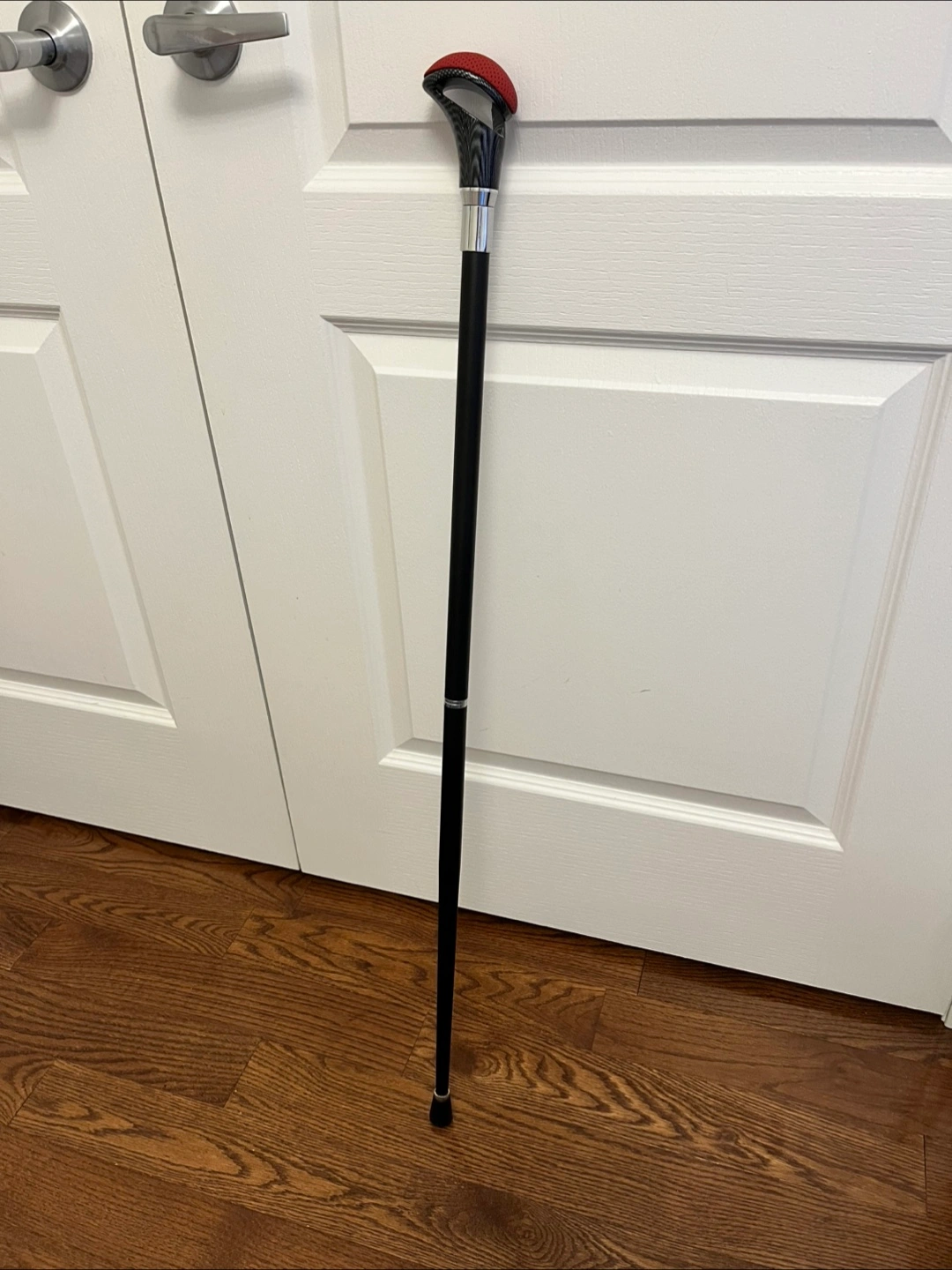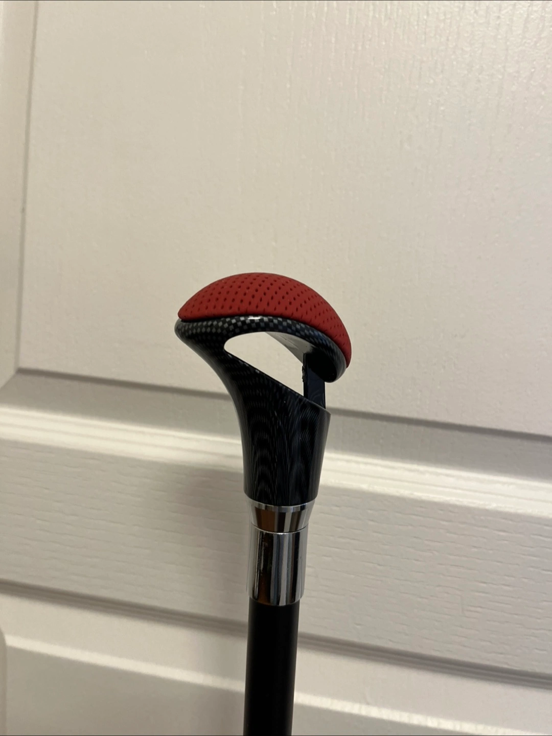 Elegant walking cane. 37 inches. Features a red and black design. Collapsible design. Carbon fibre shaft. Comfortable handle. purchased on a whim - later realized it’s too long for me.