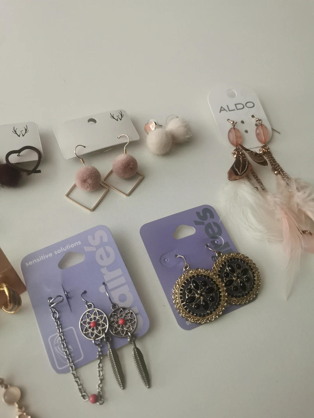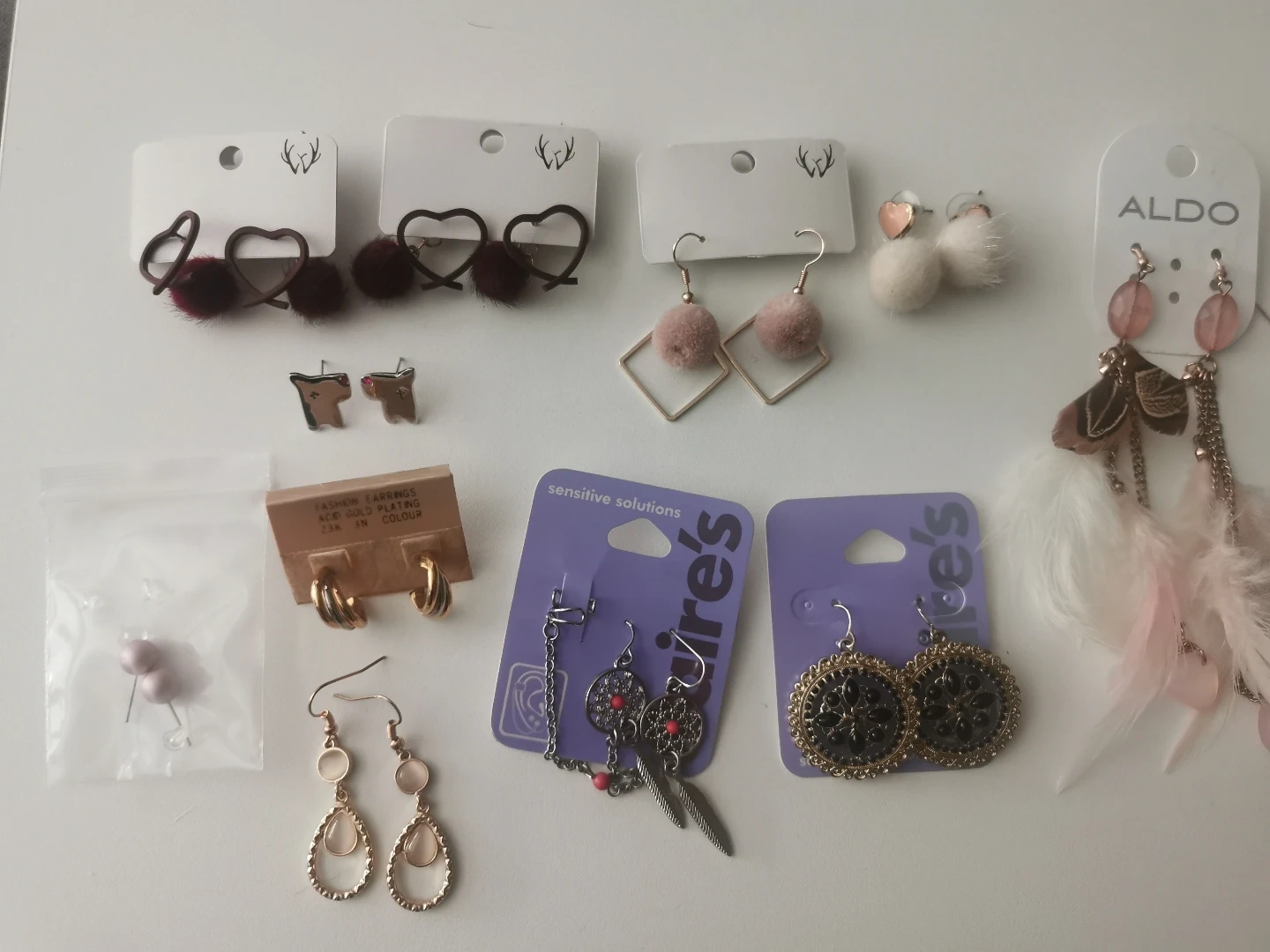 Assortment of earrings, various styles and colours. Includes pairs with pom-poms, geometric shapes, feathers, and other unique designs. Some are gold-toned, others feature other metals. Great for adding variety to your jewellery collection.