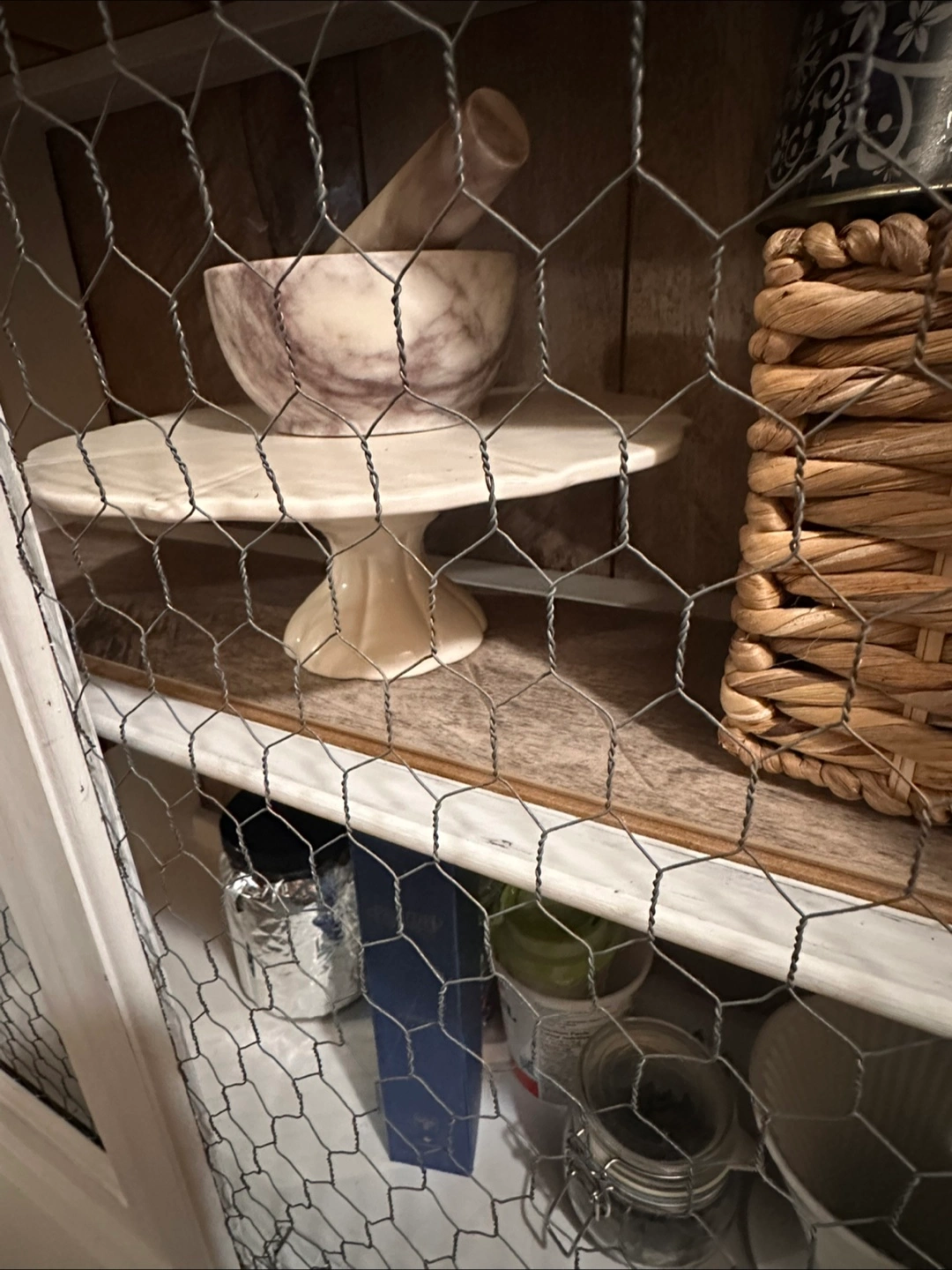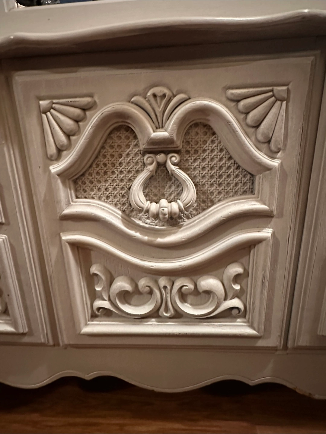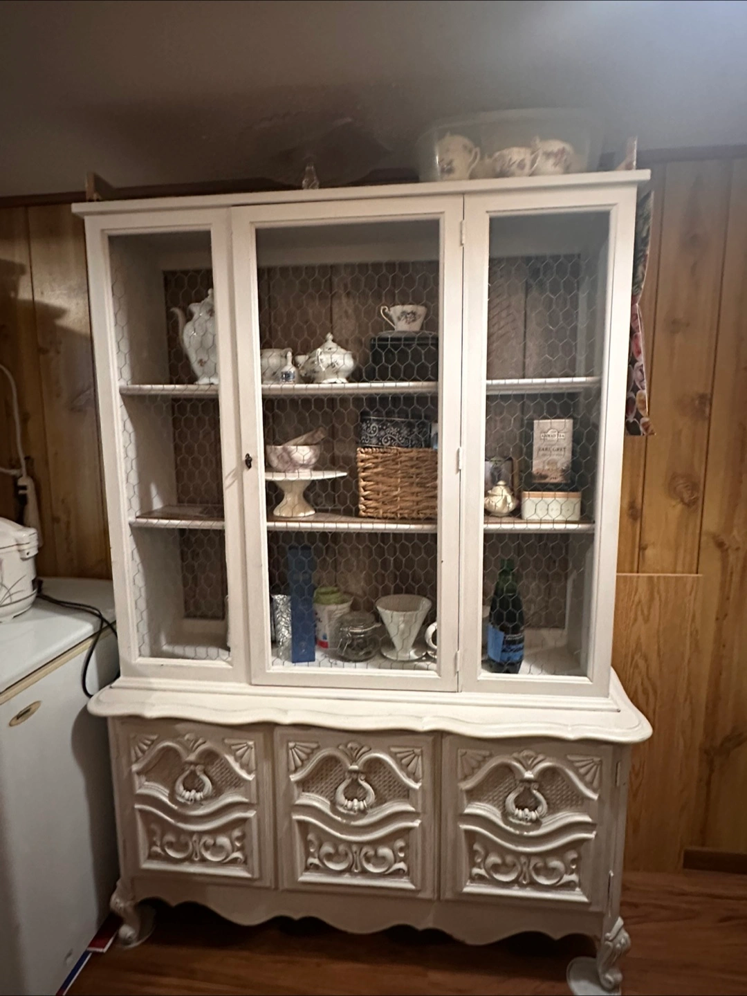Ornate, off-white painted finish. One door in the middle, three drawers below. Very spacious. Chicken wired front. Great for displaying collectibles or dishes. Unique vintage piece.