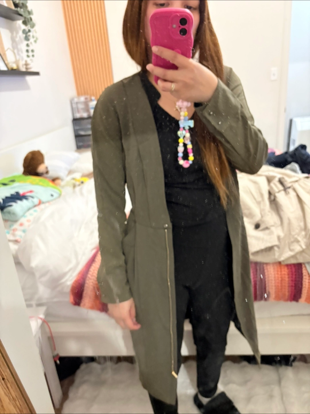 Lightweight long olive green cardigan. Zipper closure. Great for layering. Looks good with leggings or jeans.