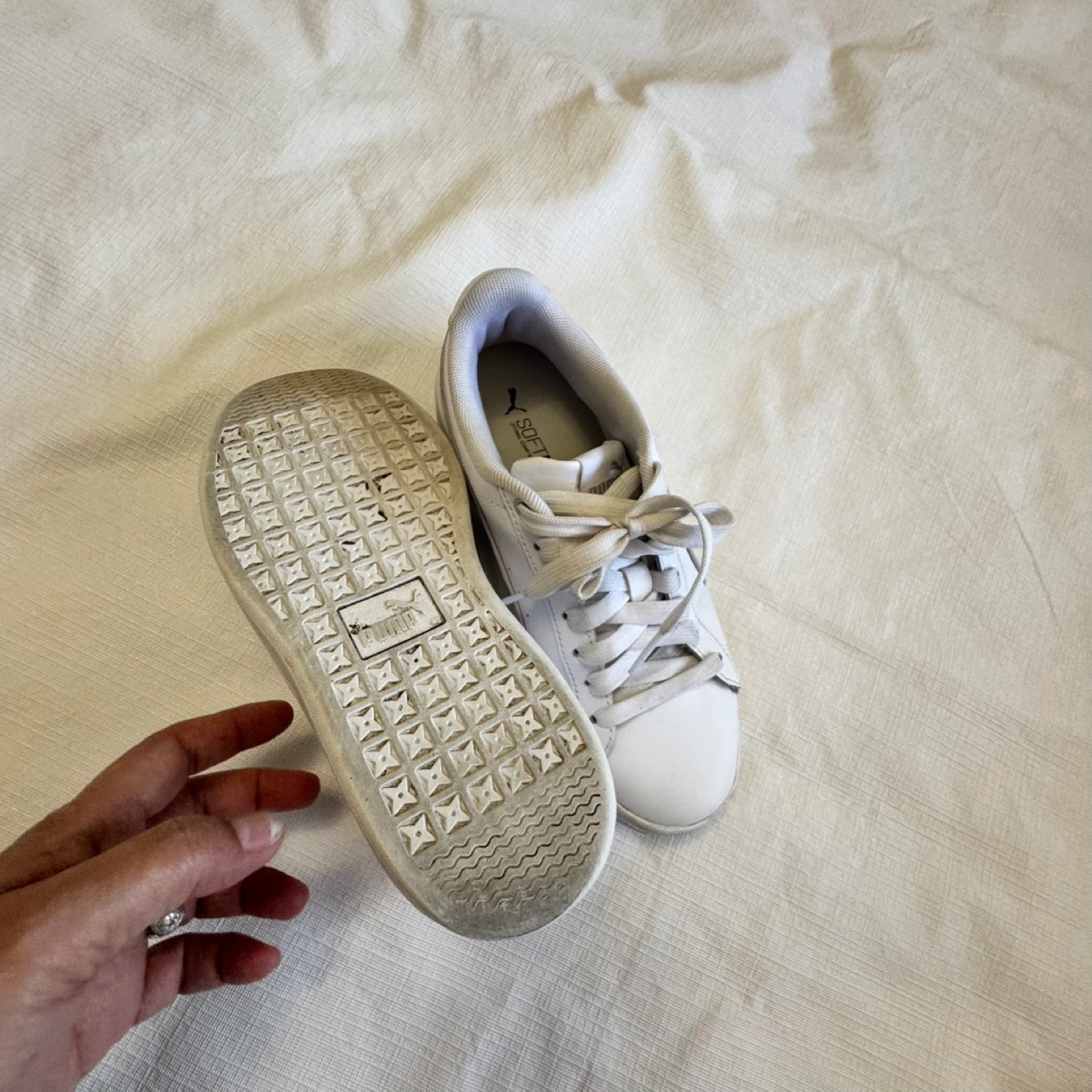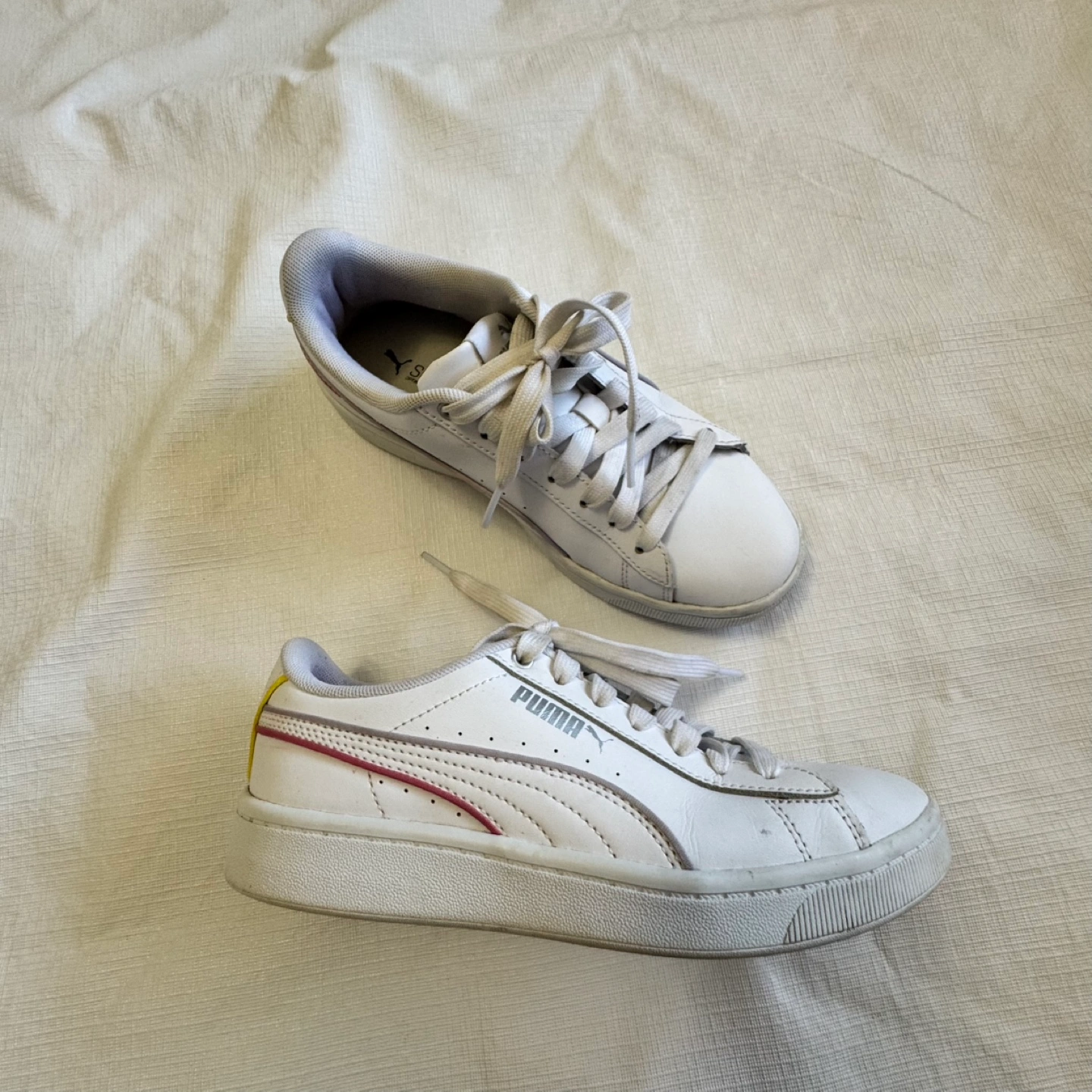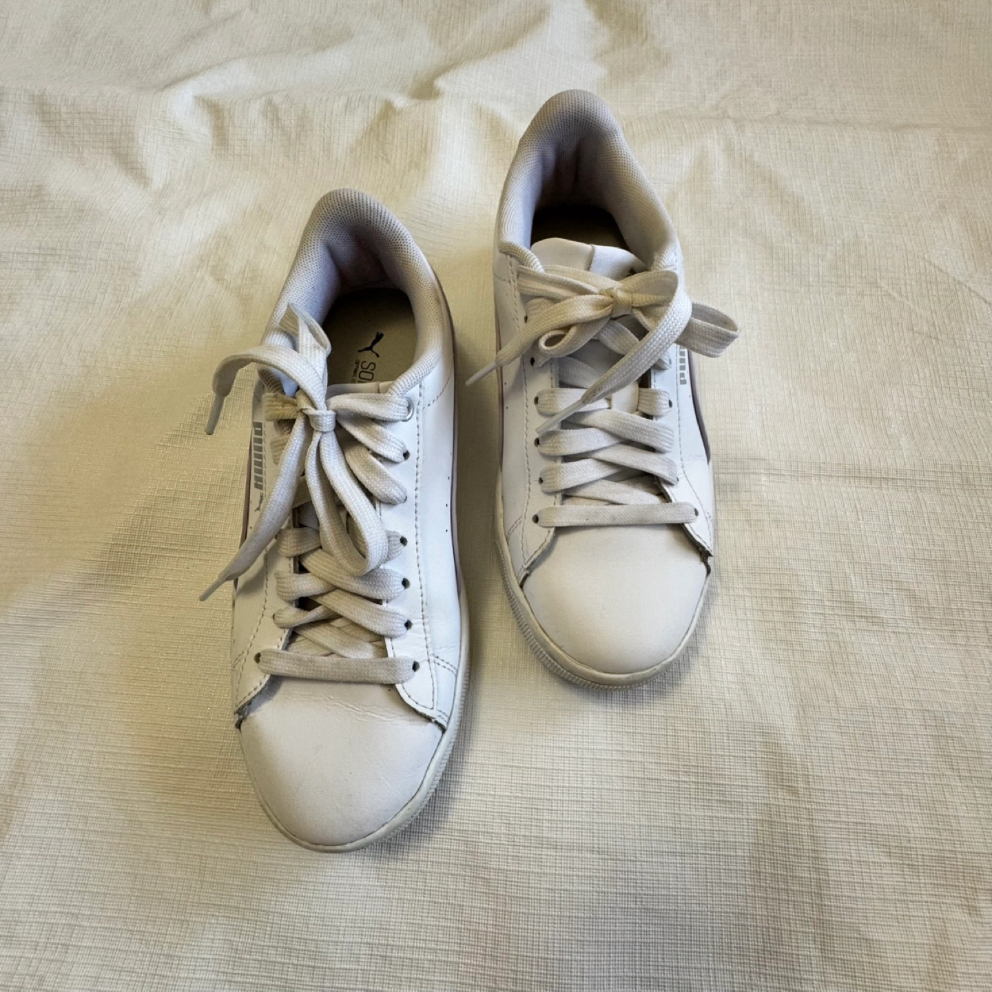 18Pre-owned Puma sneakers. White leather upper. Size 5. Minor wear and tear. Lace-up closure. Comfortable and stylish.