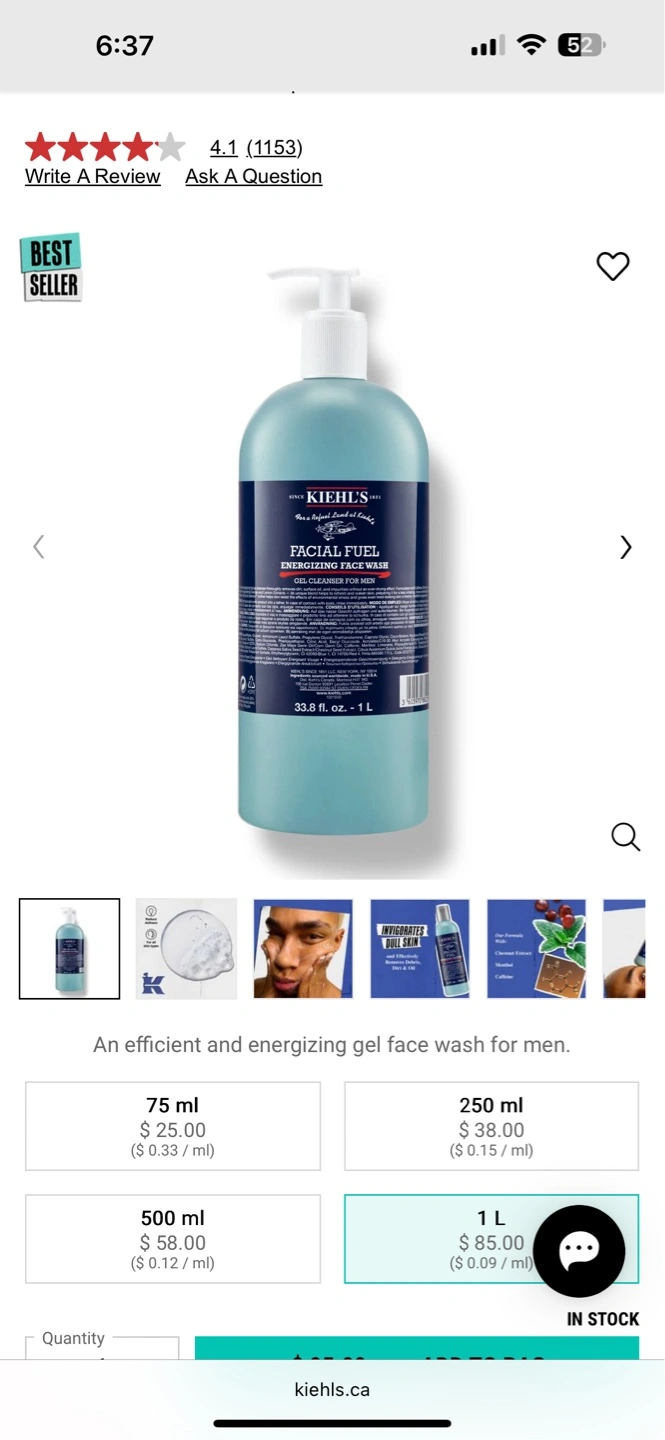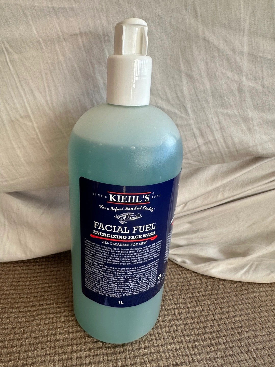 1 Litre bottle of Kiehl's Facial Fuel Energizing Face Wash. Gel cleanser for men. Thoroughly removes dirt and impurities without over-drying.