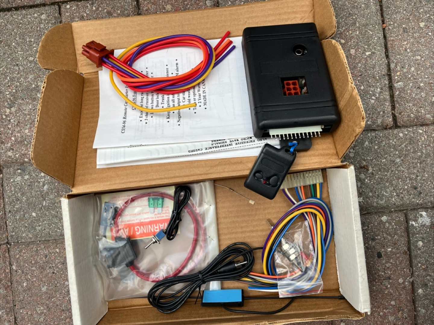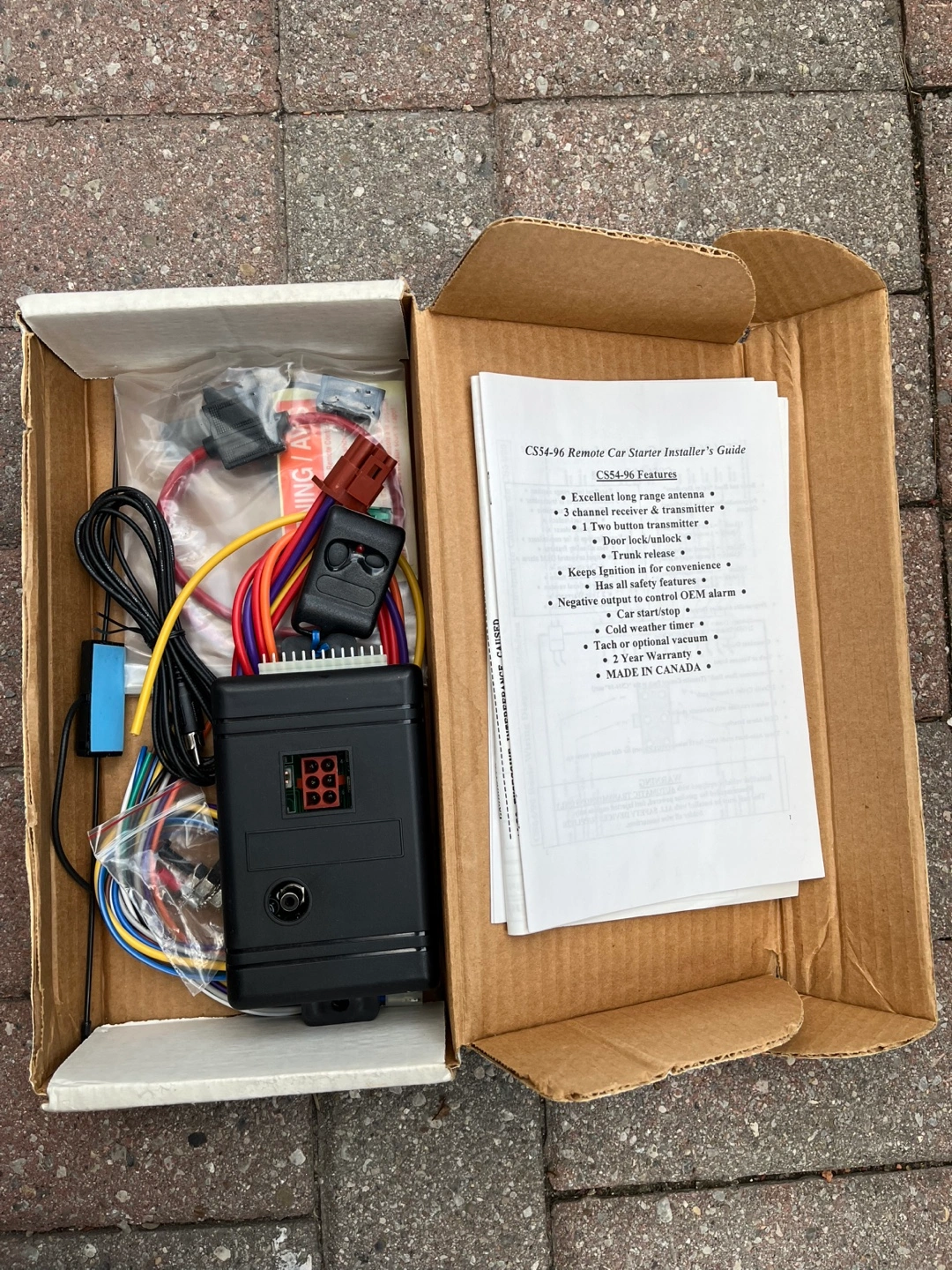 235New, unused remote car starter kit. Includes main unit, remote, wiring harness, and instructions. Made in Canada. Excellent long-range antenna. 3-channel receiver & transmitter. Keeps car warm in winter.