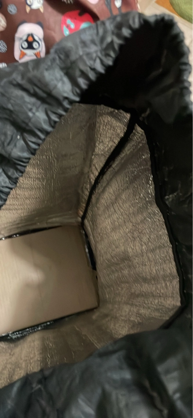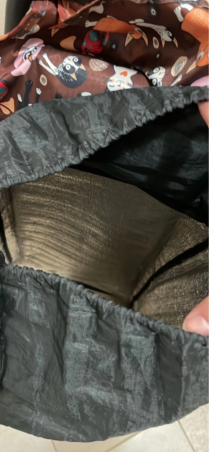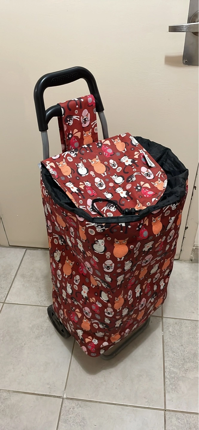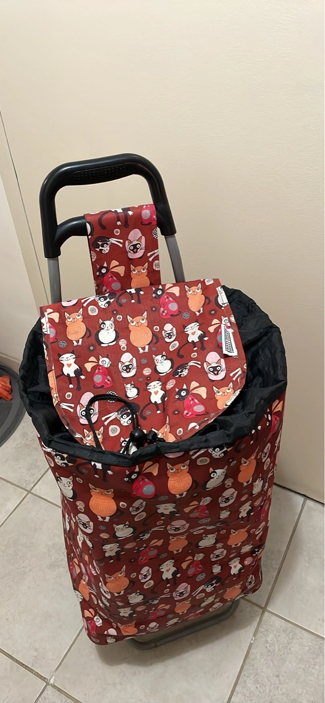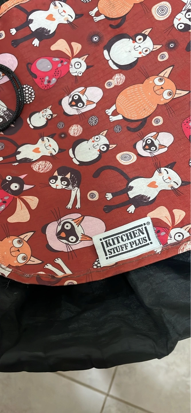 Reusable shopping cart cover. Features a fun cat print. Insulated interior. Folds compactly for storage. Black interior lining.