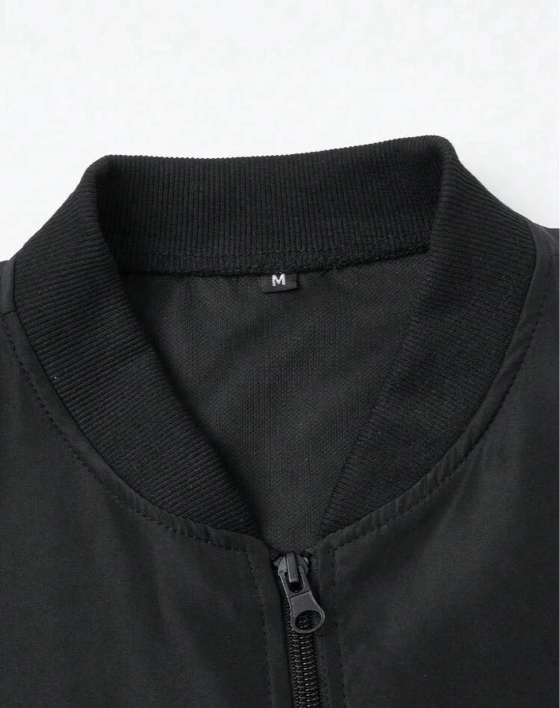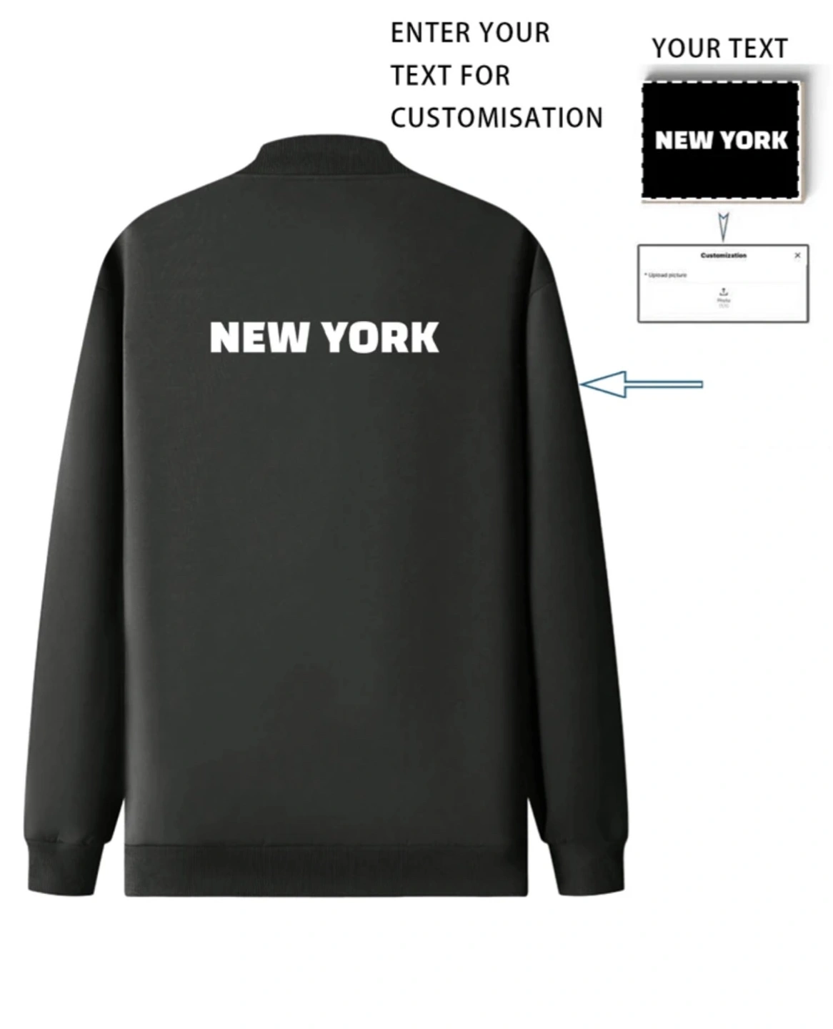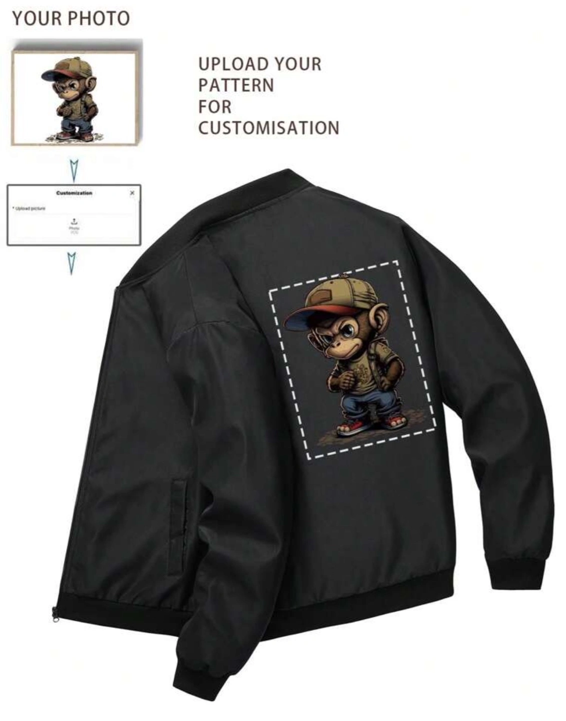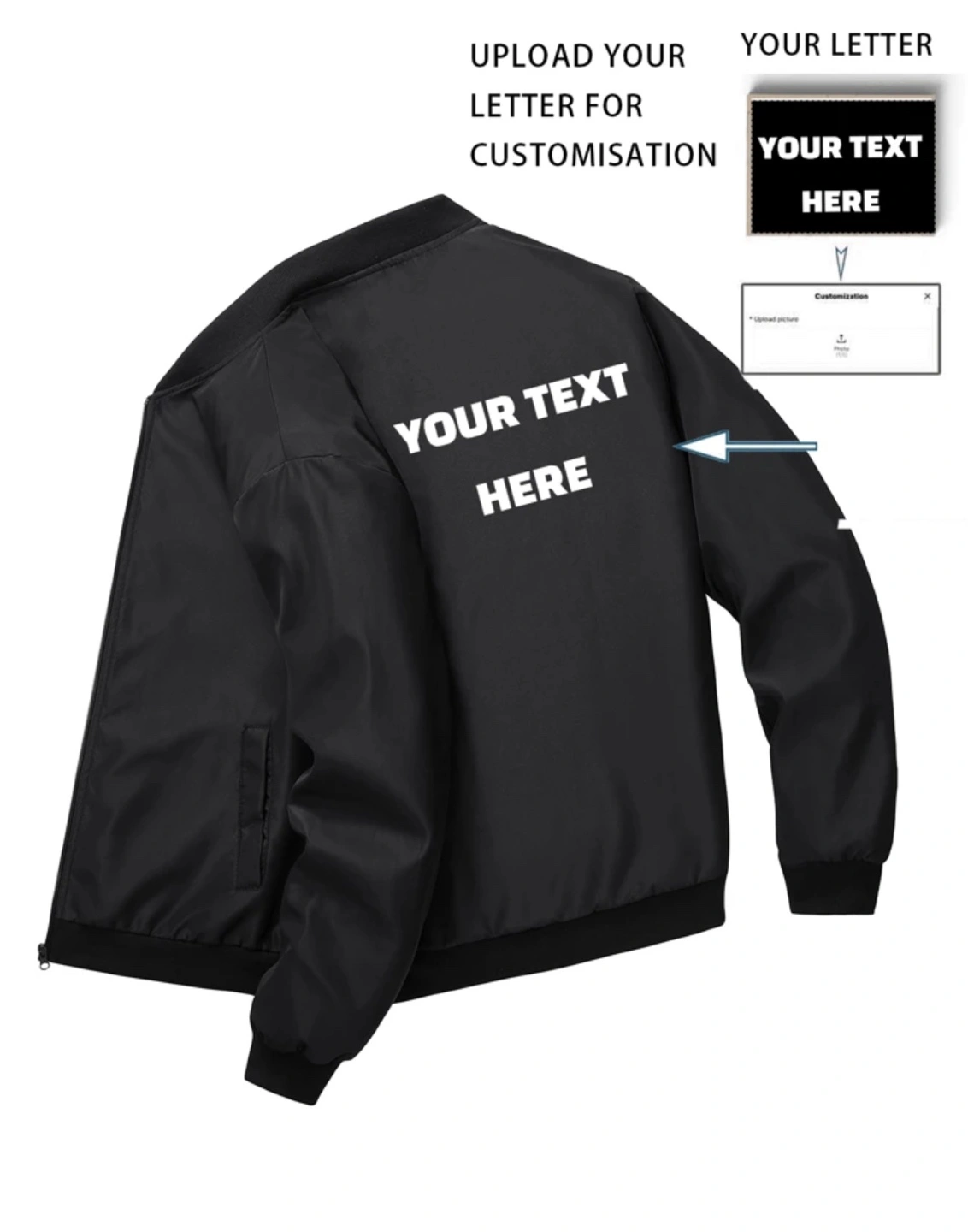 Men's black bomber jacket. Fully customizable; send your own text or image. Features a zipper closure and ribbed collar.