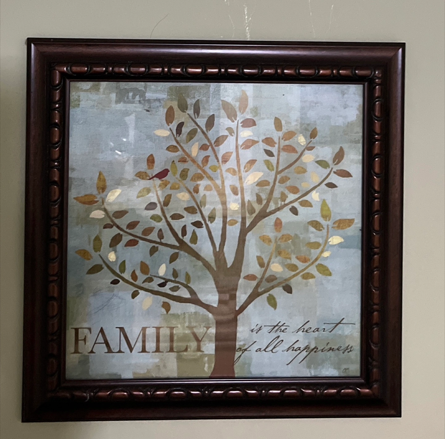 Brown framed wall art. Features a family tree image with the word FAMILY and a quote about happiness. Looks great in a home.