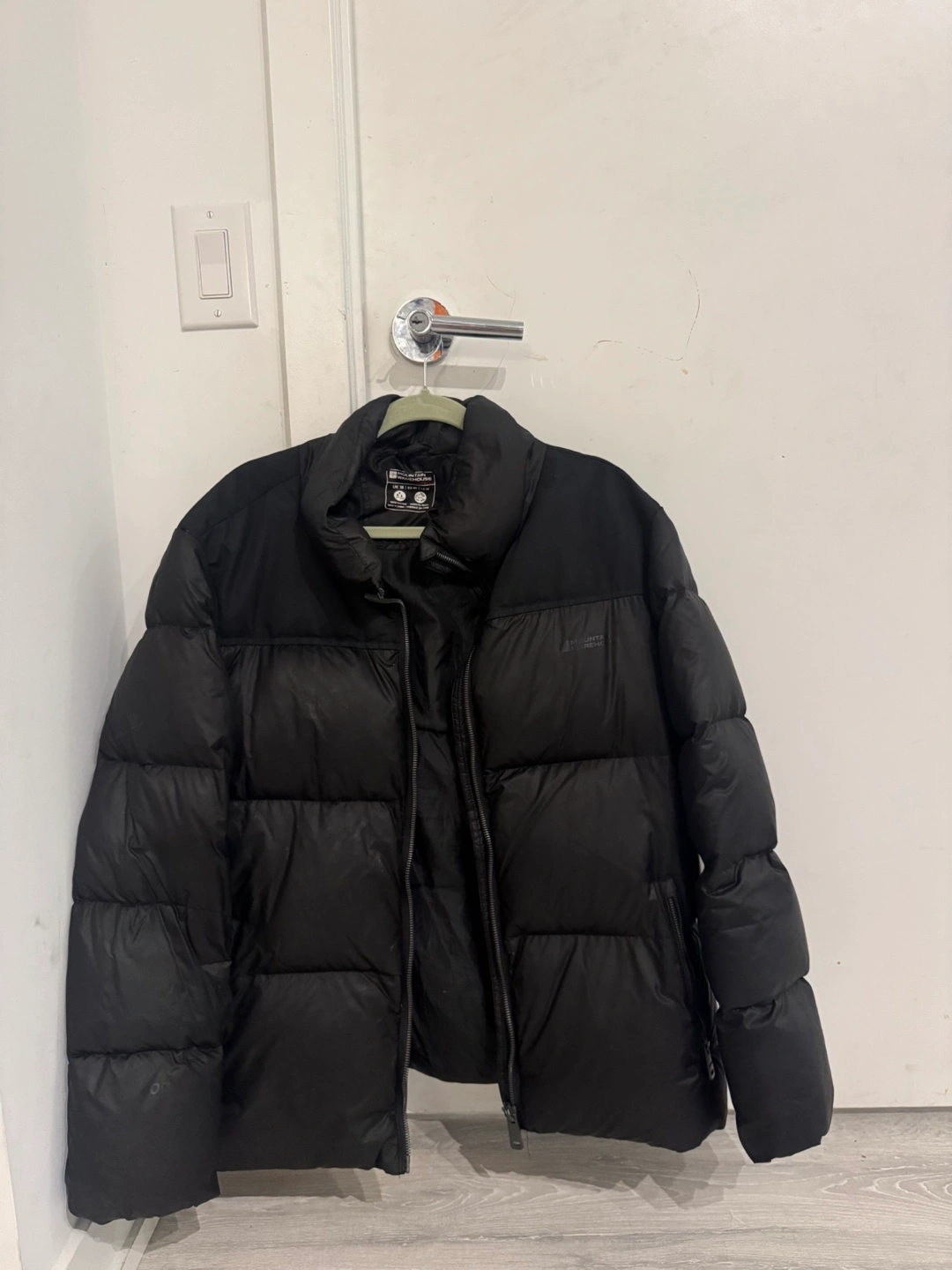Men's black puffer jacket. Features a zipper closure and pockets. Warm and comfortable for winter.