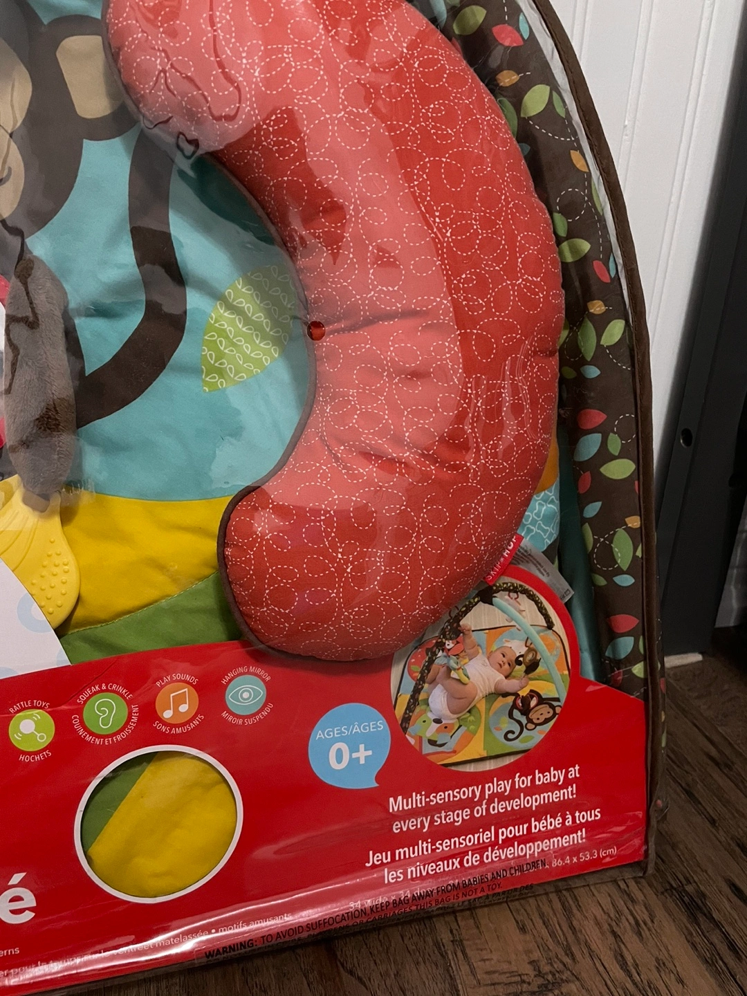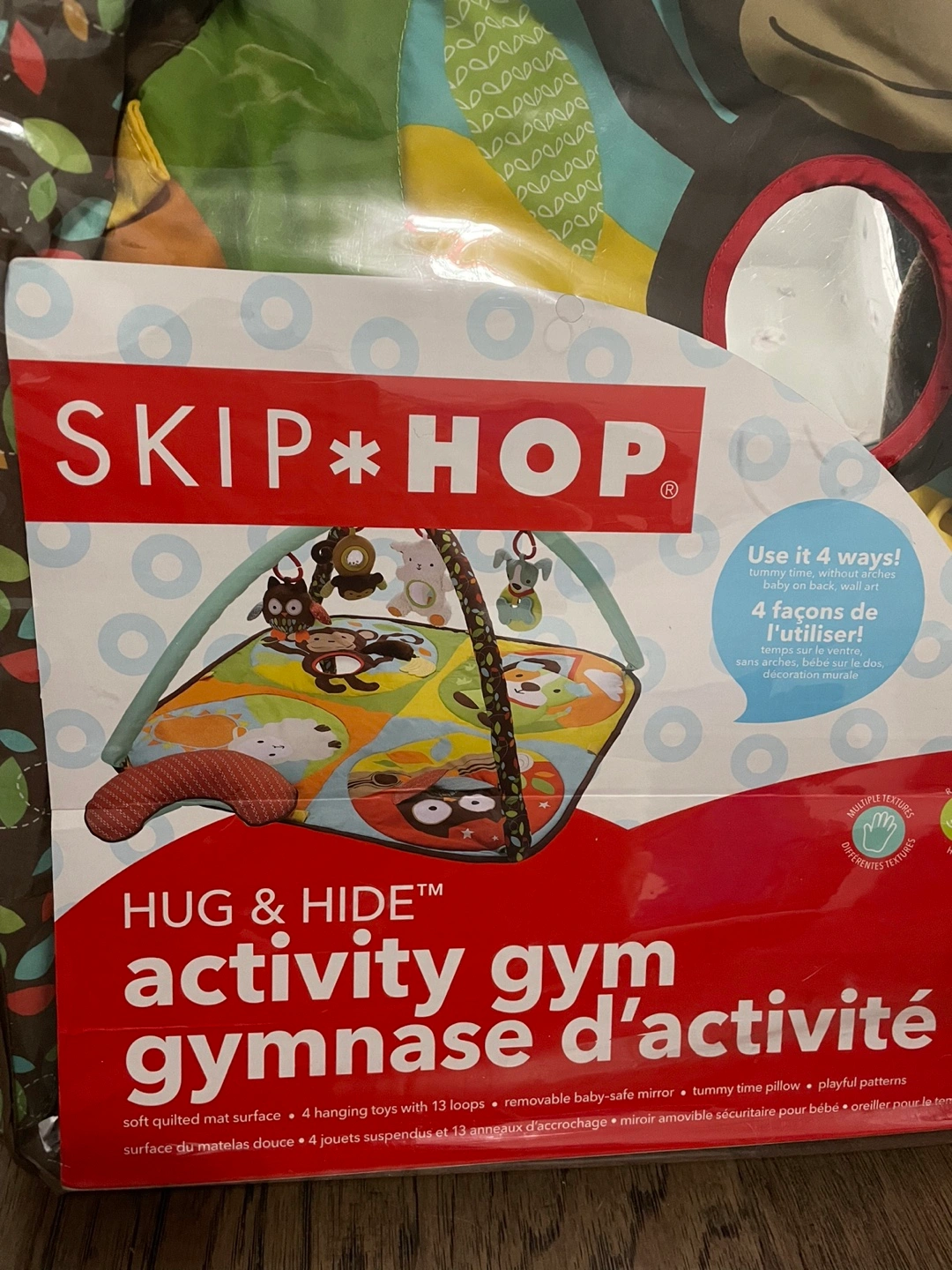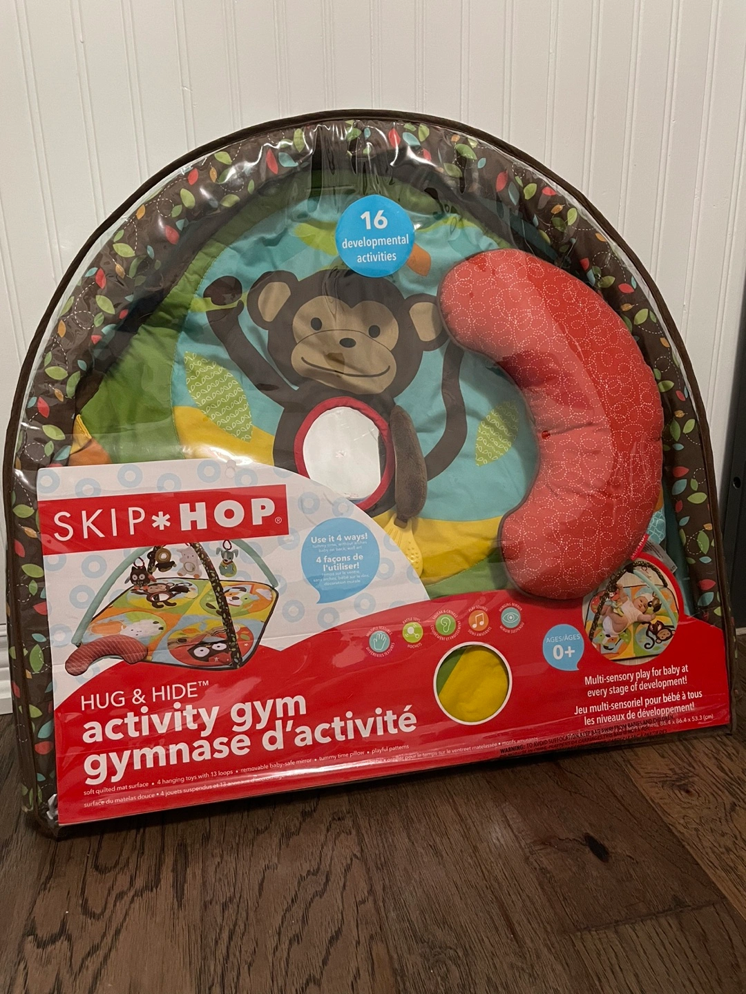 Multi-sensory play gym for baby. Features 16 developmental activities. Includes soft quilted mat, hanging toys, and a removable baby-safe mirror. Use it 4 ways!