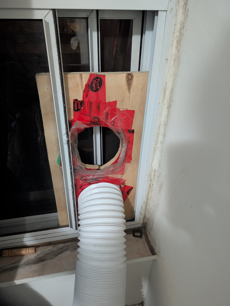 Portable air conditioner, great for smaller spaces. Includes window venting kit.
