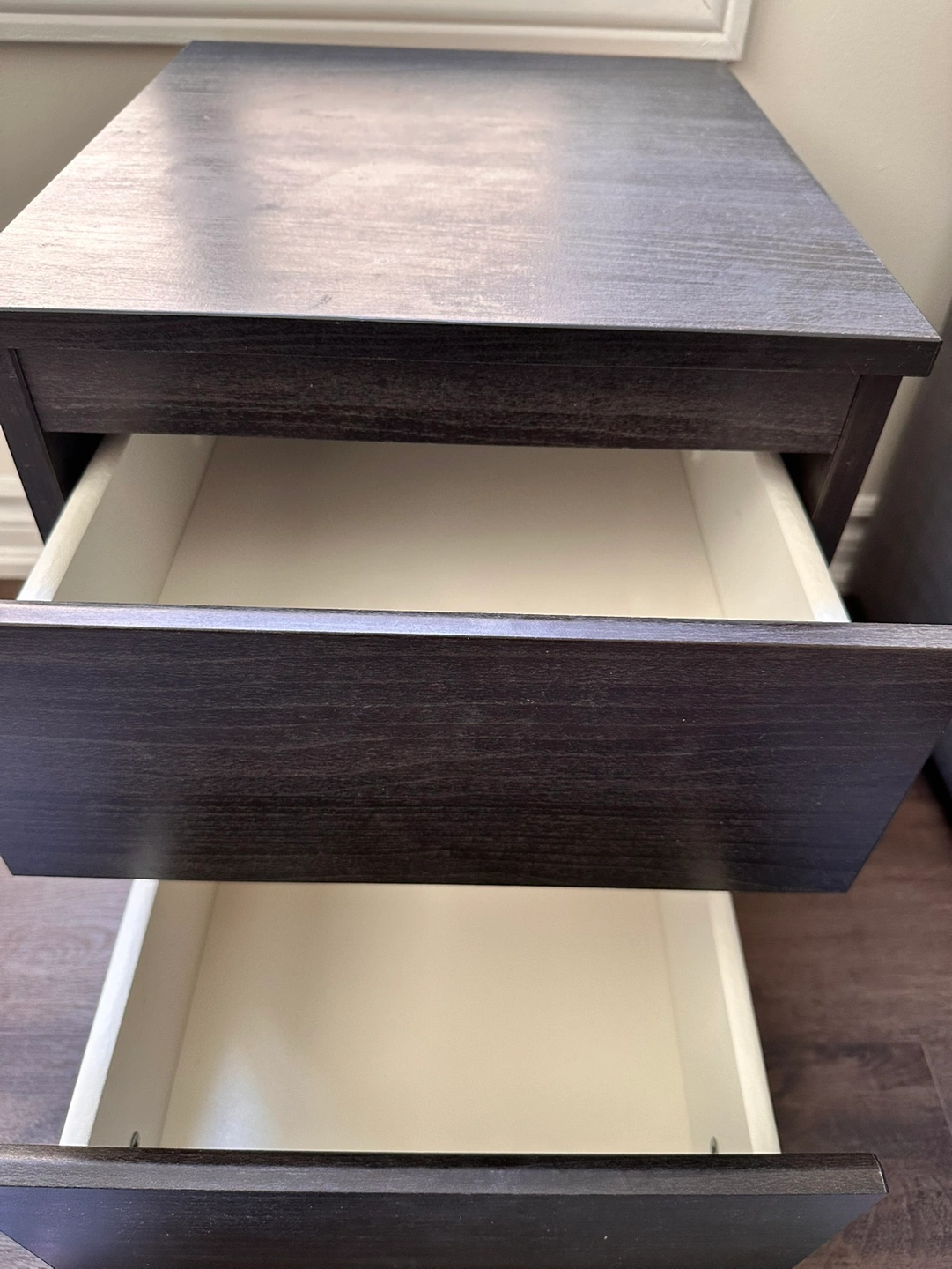 Dark brown nightstand with two drawers. Small, space-saving design. Good for bedrooms or small spaces. Some minor wear. Cash preferred.