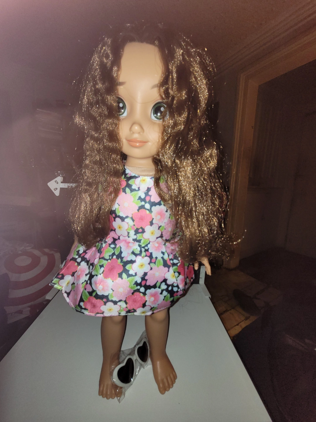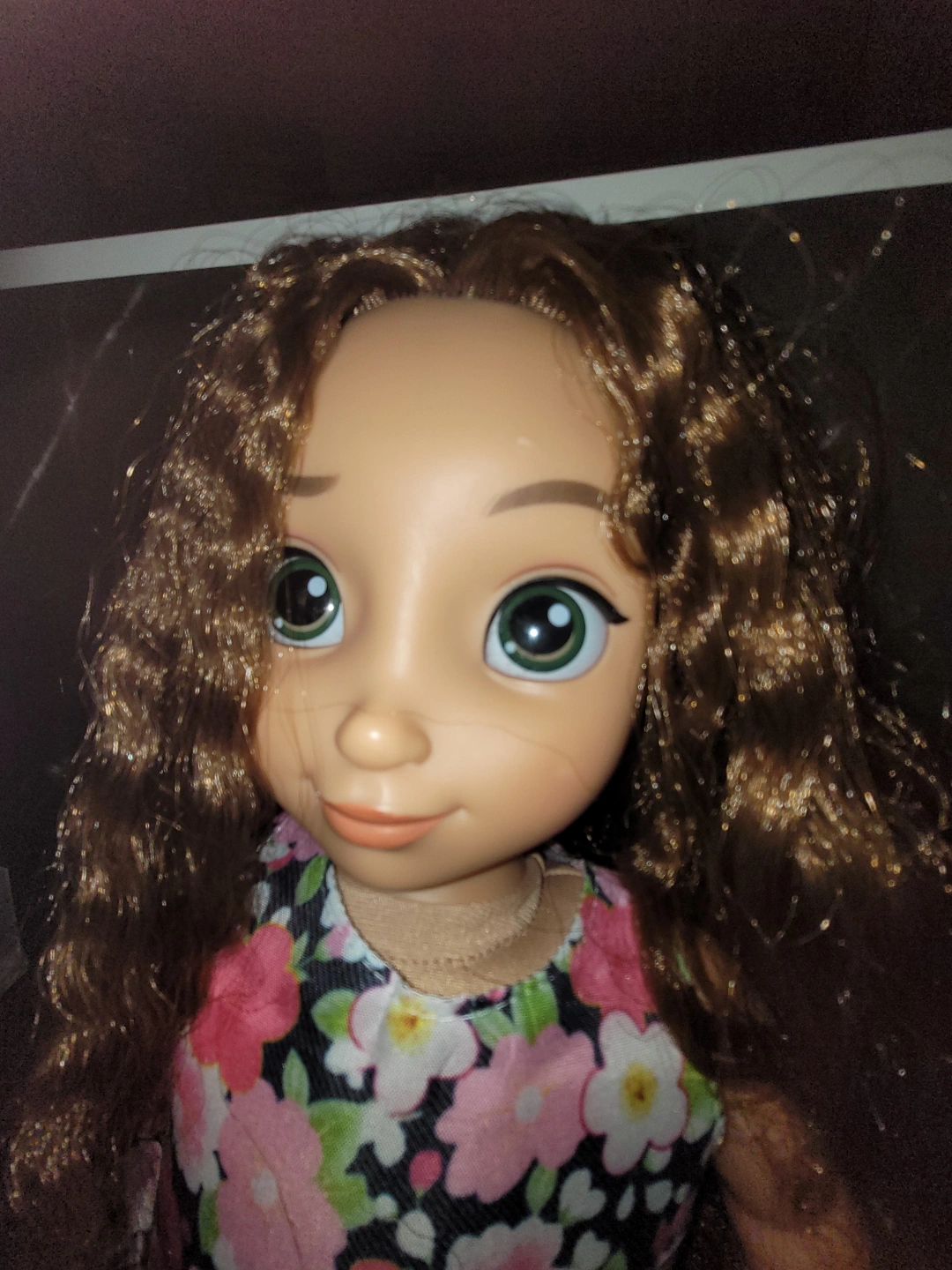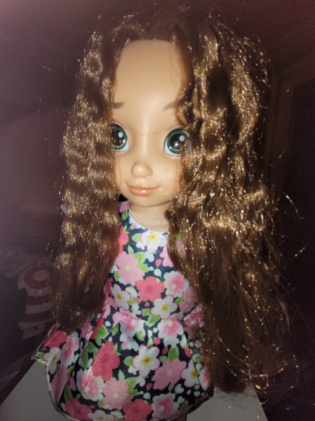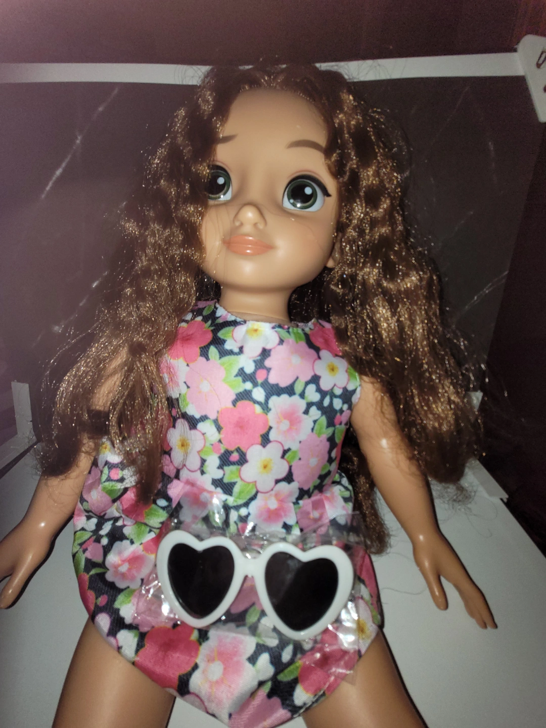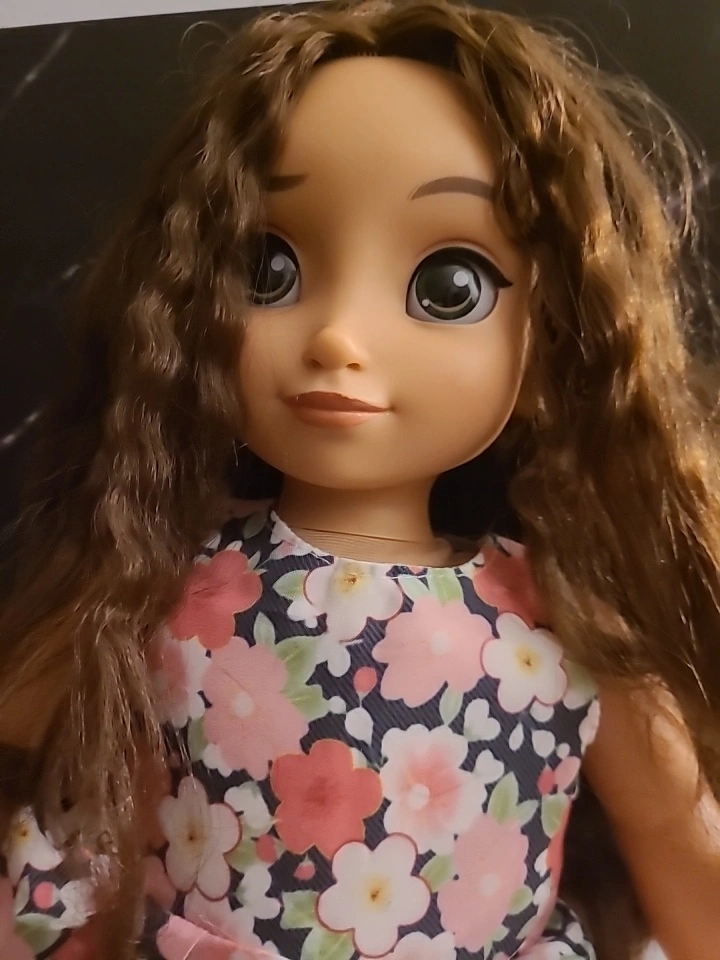 Adorable Disney Animators' Collection doll. Long brown curly hair. Floral dress. Includes heart-shaped sunglasses. Perfect for collectors or children. Some light stains on her feet, but otherwise in great condition. Hair is a bit tangled but not matted. Dress is unbranded, but dress and sunglasses are new.