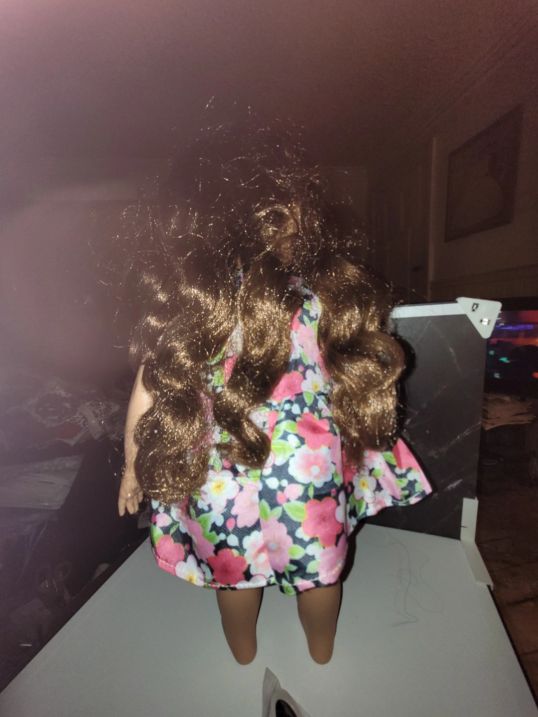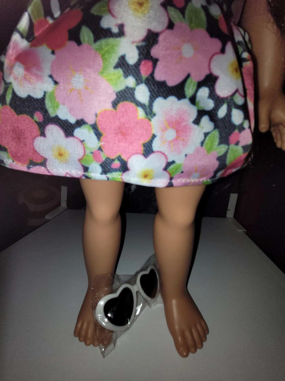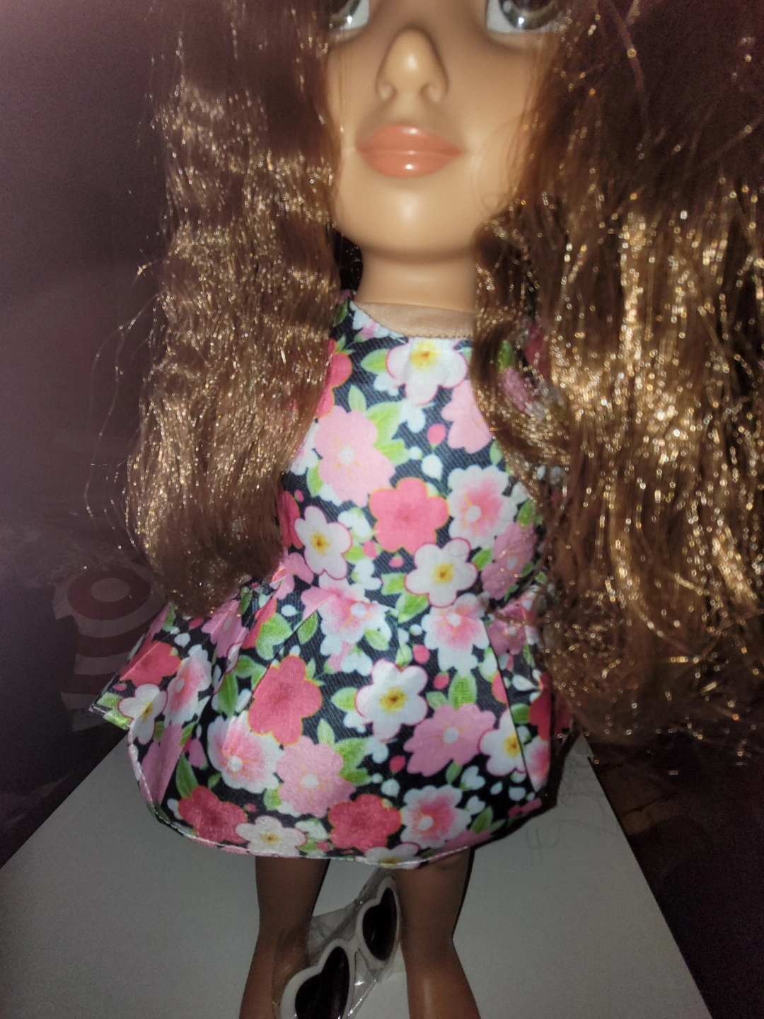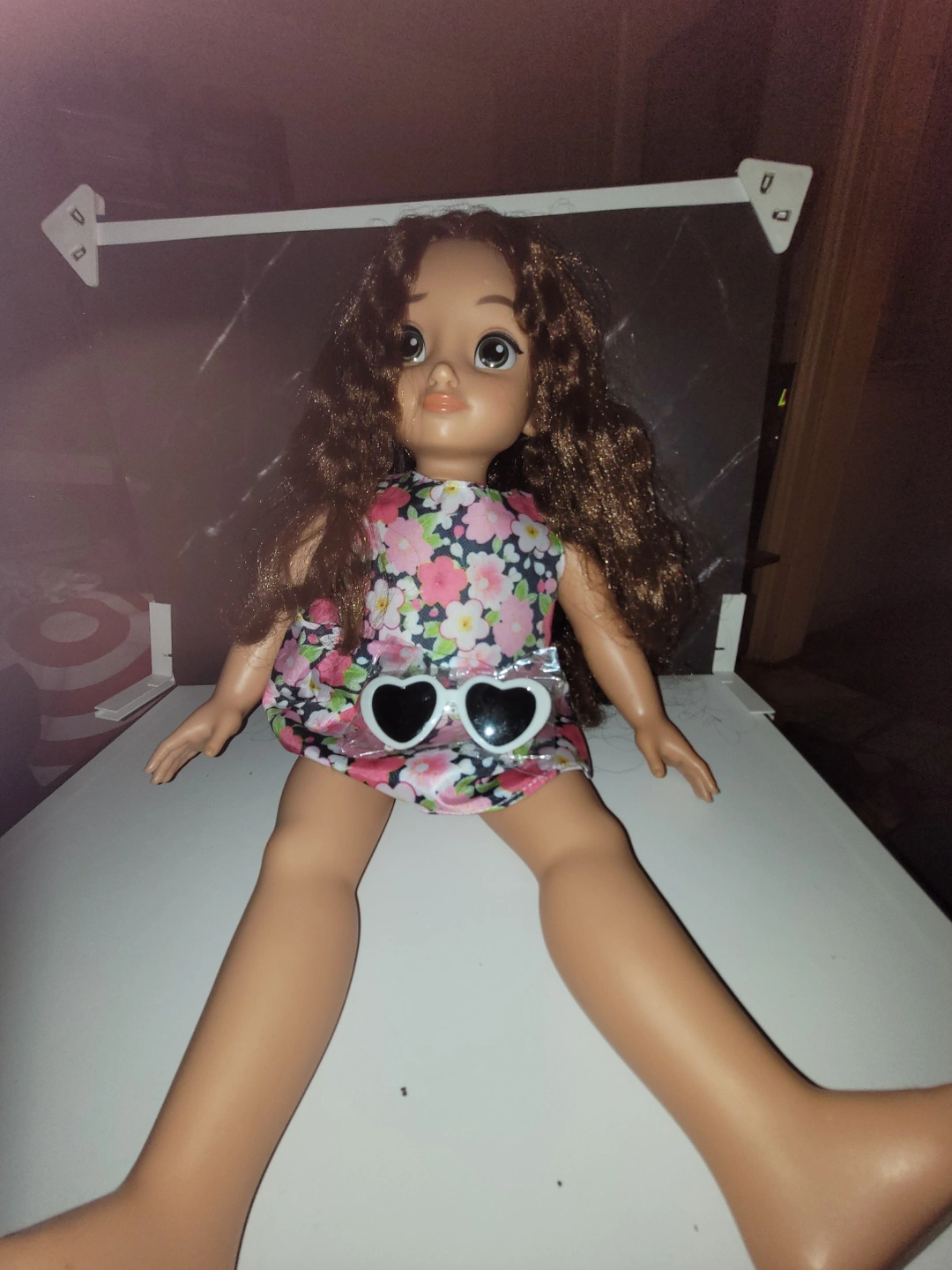 Adorable Disney Animators' Collection doll. Long brown curly hair. Floral dress. Includes heart-shaped sunglasses. Perfect for collectors or children. Some light stains on her feet, but otherwise in great condition. Hair is a bit tangled but not matted. Dress is unbranded, but dress and sunglasses are new.