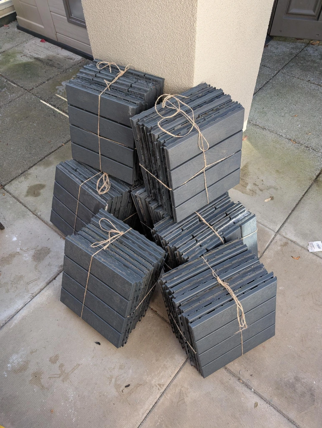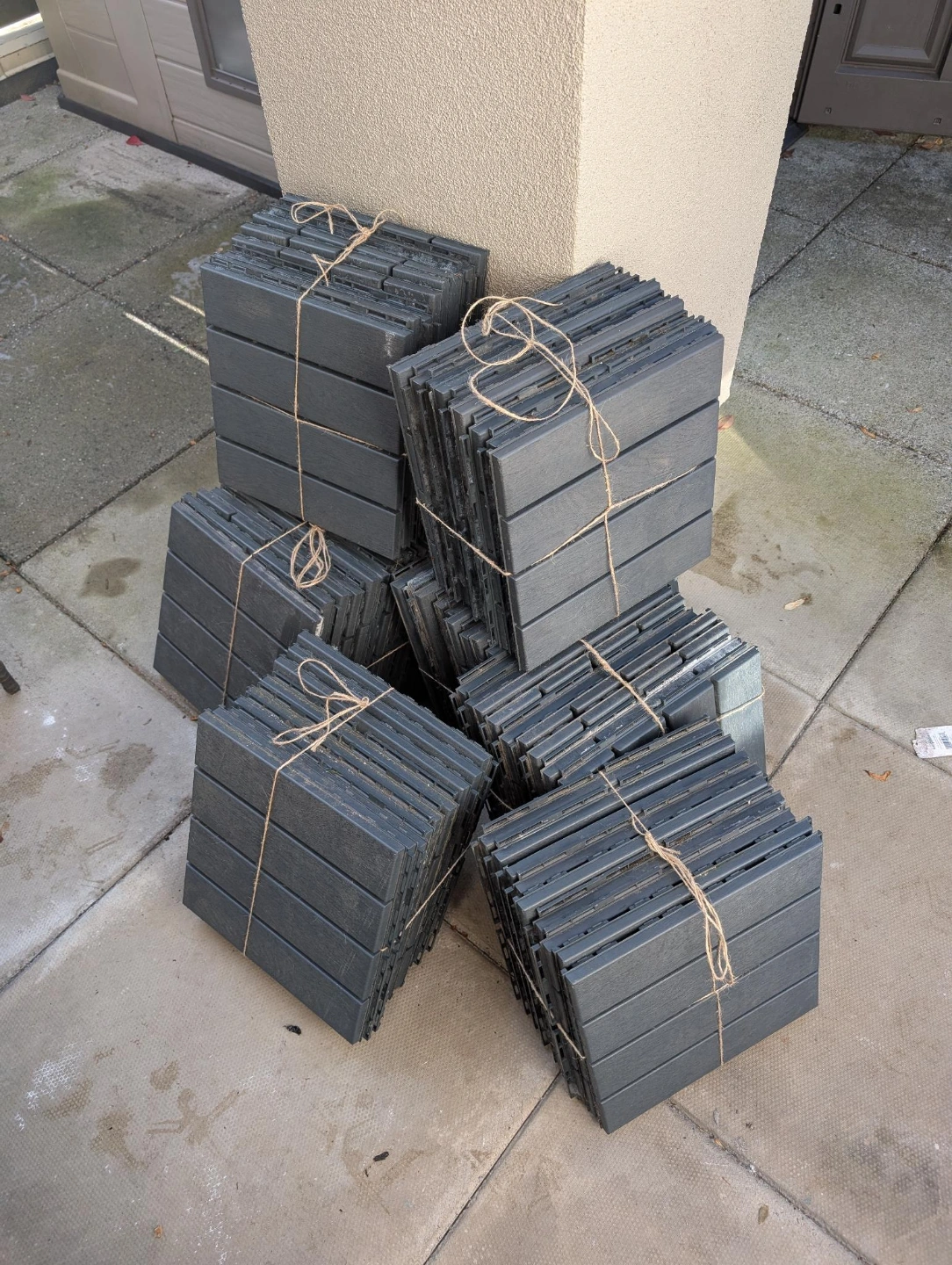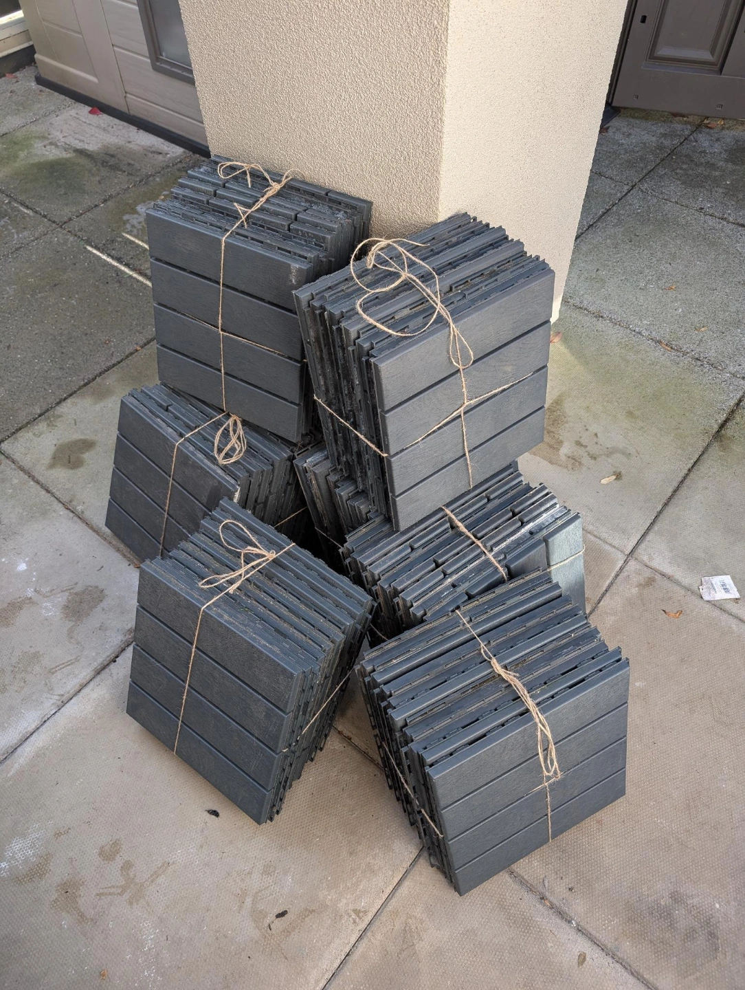 72 outdoor ikea RUNNEN tiles. Please take all. Were stores in an indoor shed over winter and have been scrubbed too. Used, but pretty good condition. Pick up only!
