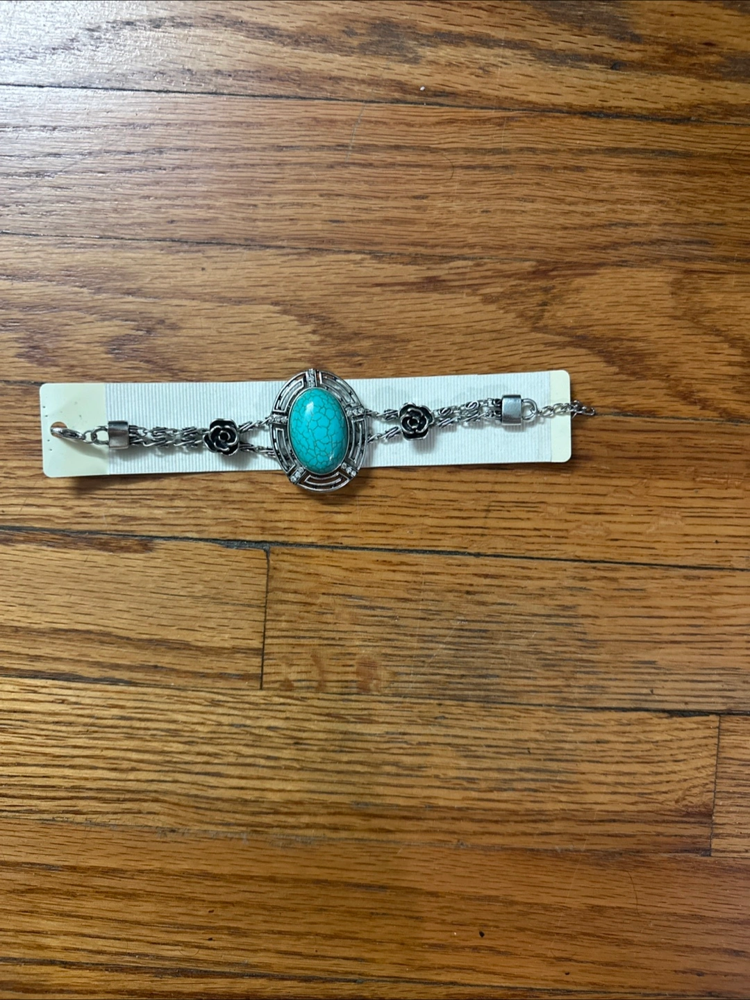 Beautiful turquoise statement bracelet. Features a large oval turquoise stone and smaller black accents. Silver-toned metal chain and clasp. Perfect for adding a touch of bohemian style to any outfit.