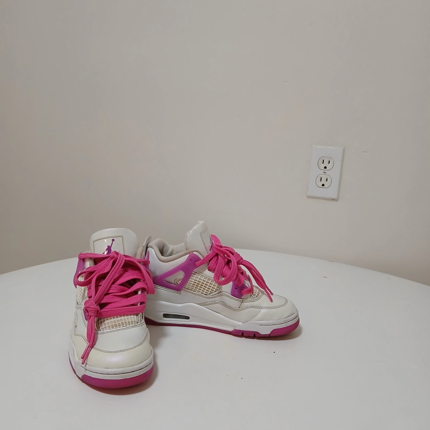Pre-owned Air Jordan 4 Retro sneakers. White leather upper, pink accents. Pink laces. Great for casual wear.