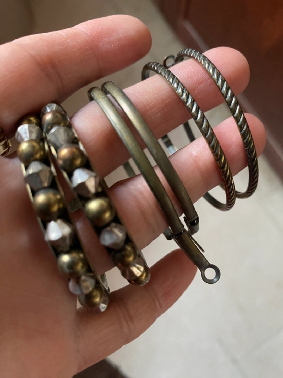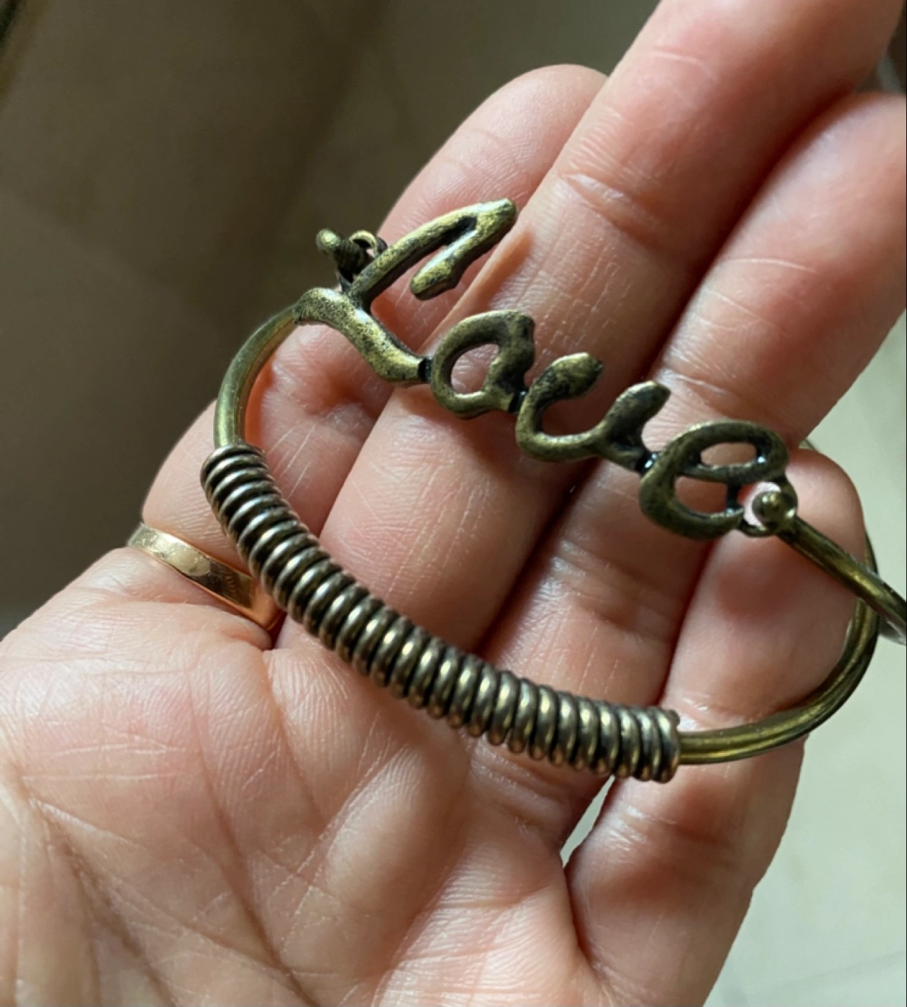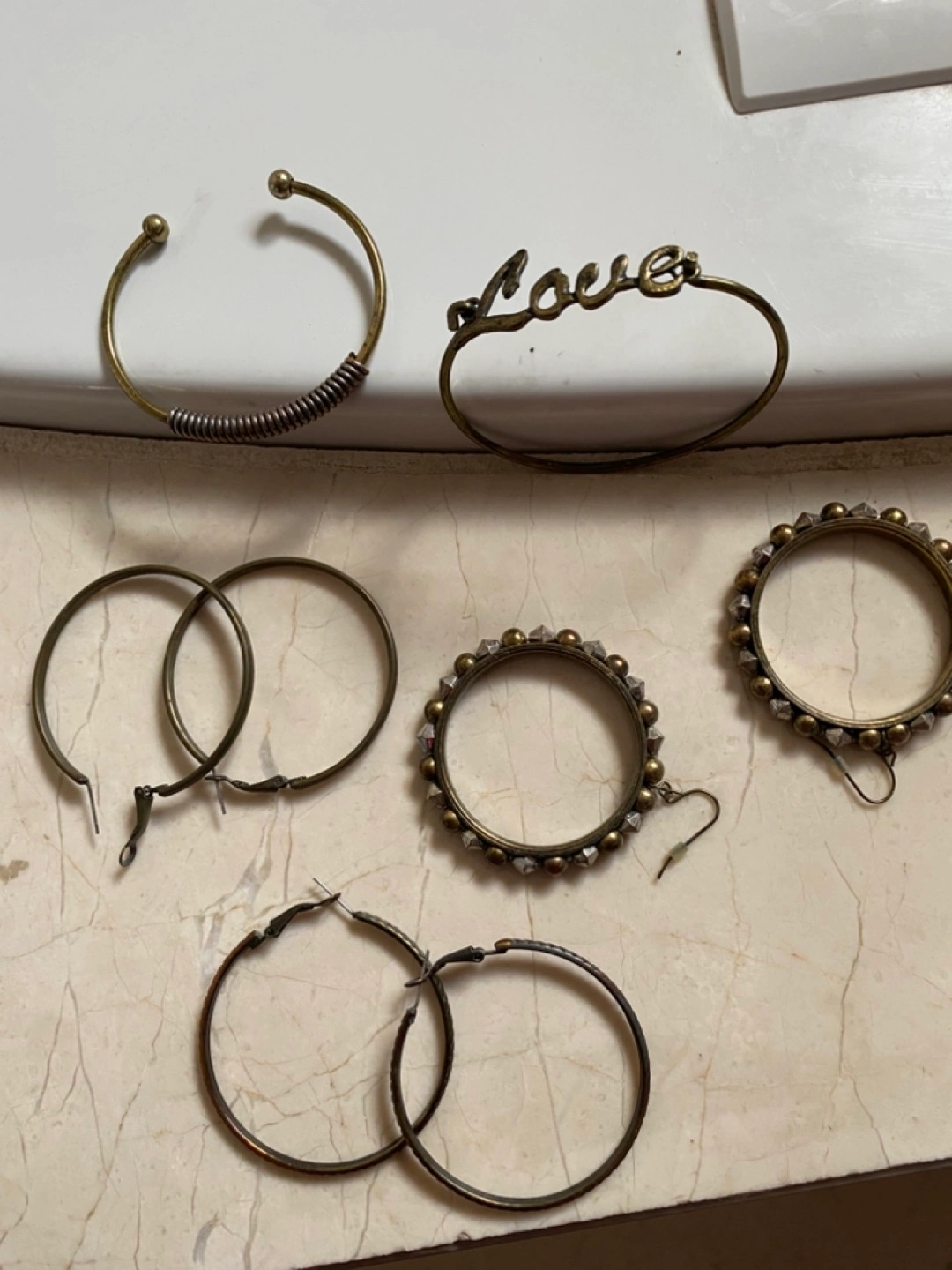 Assortment of six bronze-toned jewellery pieces. Includes hoop earrings, a bracelet with a ‘Love’ inscription, and other decorative bracelets. Great for layering or individual use. Cash Only
