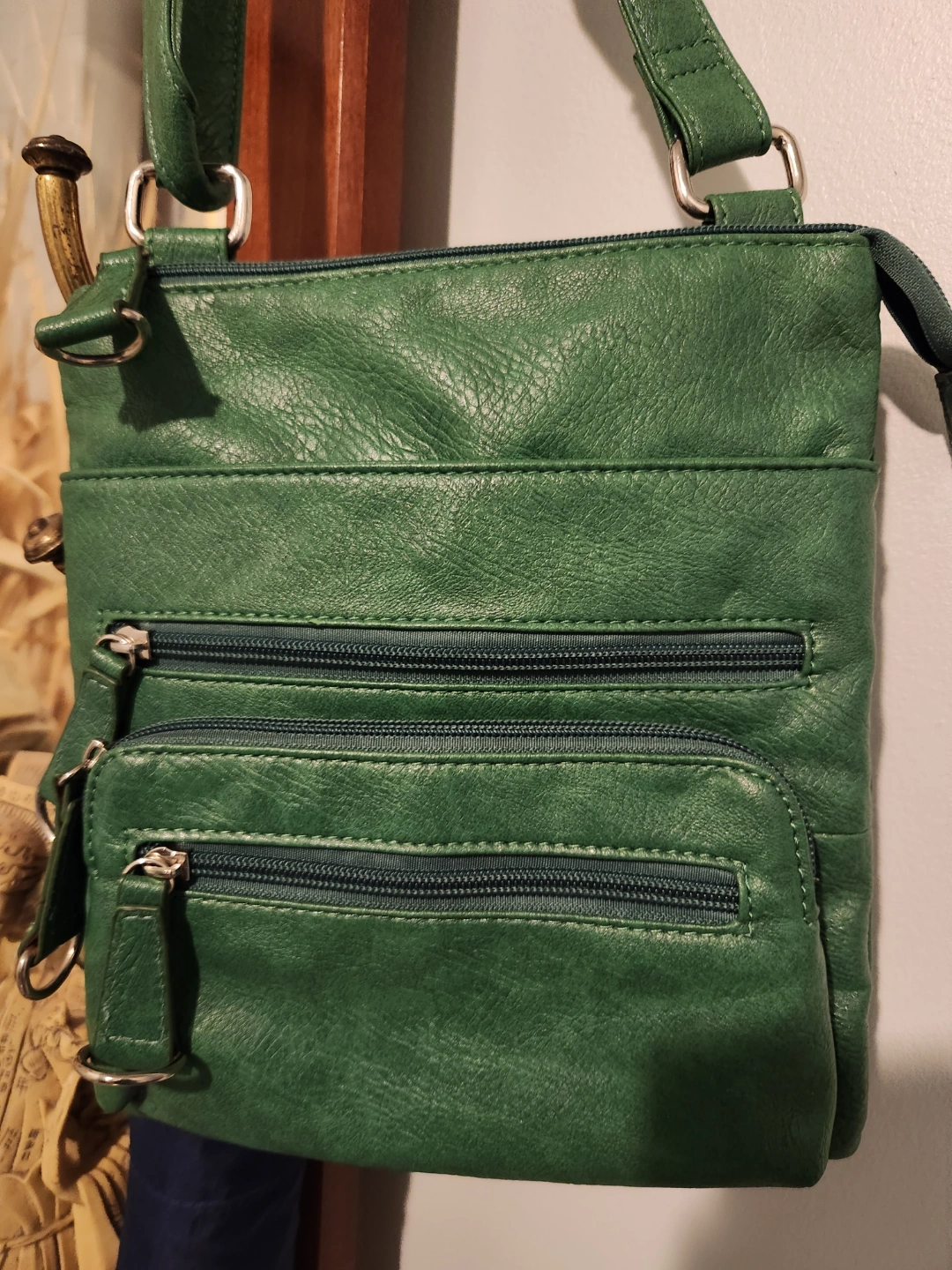 Small teal crossbody bag. Features a zipper closure and beige interior lining. Interior zipper pocket. Excellent condition.
