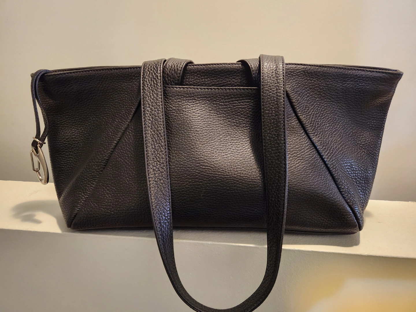 Black leather bag. Two long shoulder straps. Zipper closure. Interior lining. Two outside pockets.Small Danier logo tag inside.