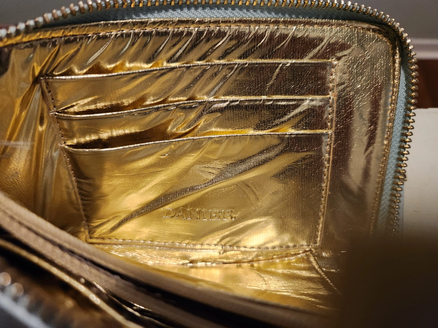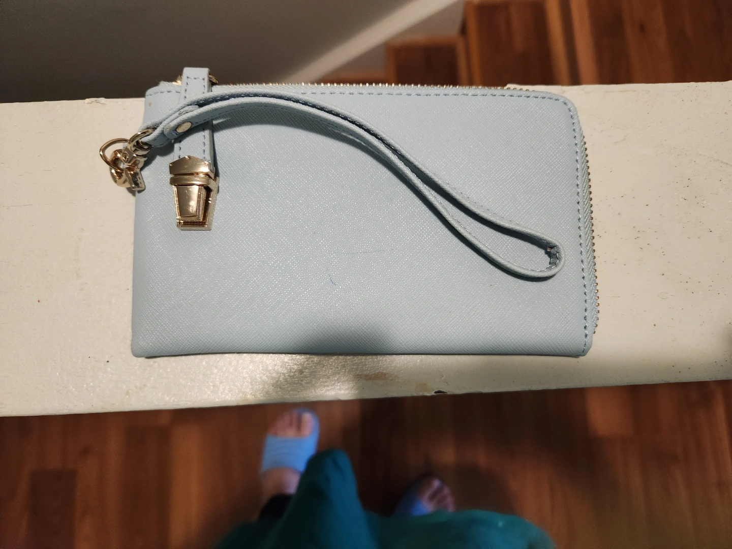 Adorable light blue wristlet. Features gold hardware and interior. Multiple card slots in gold colour. Great for everyday use.