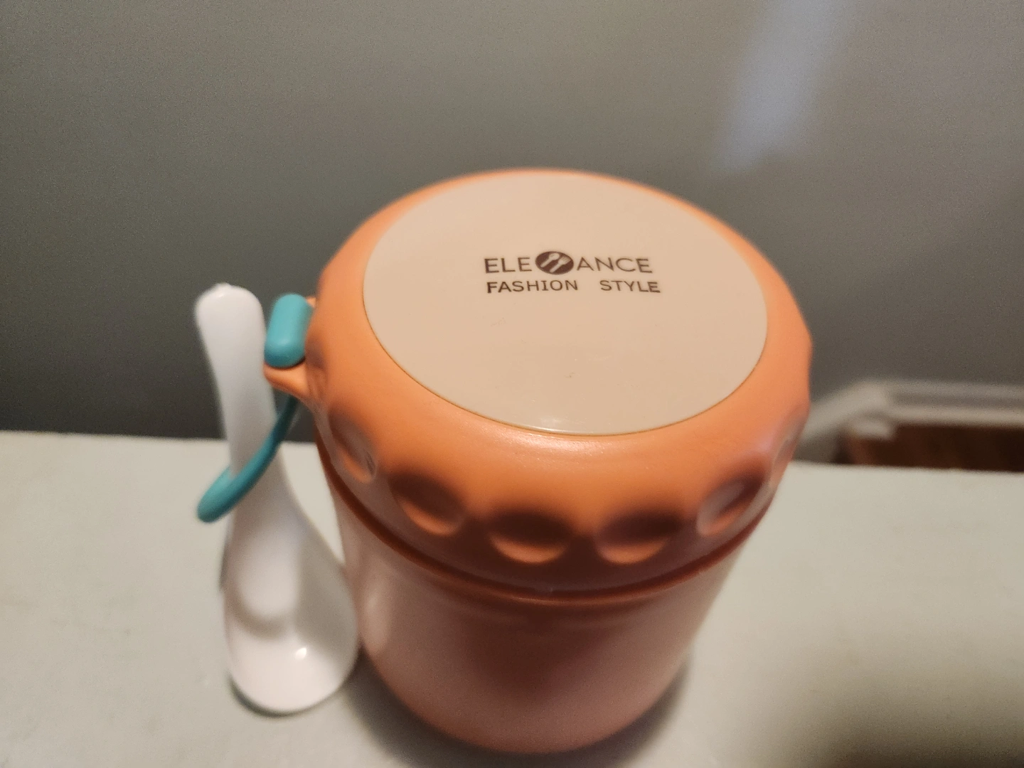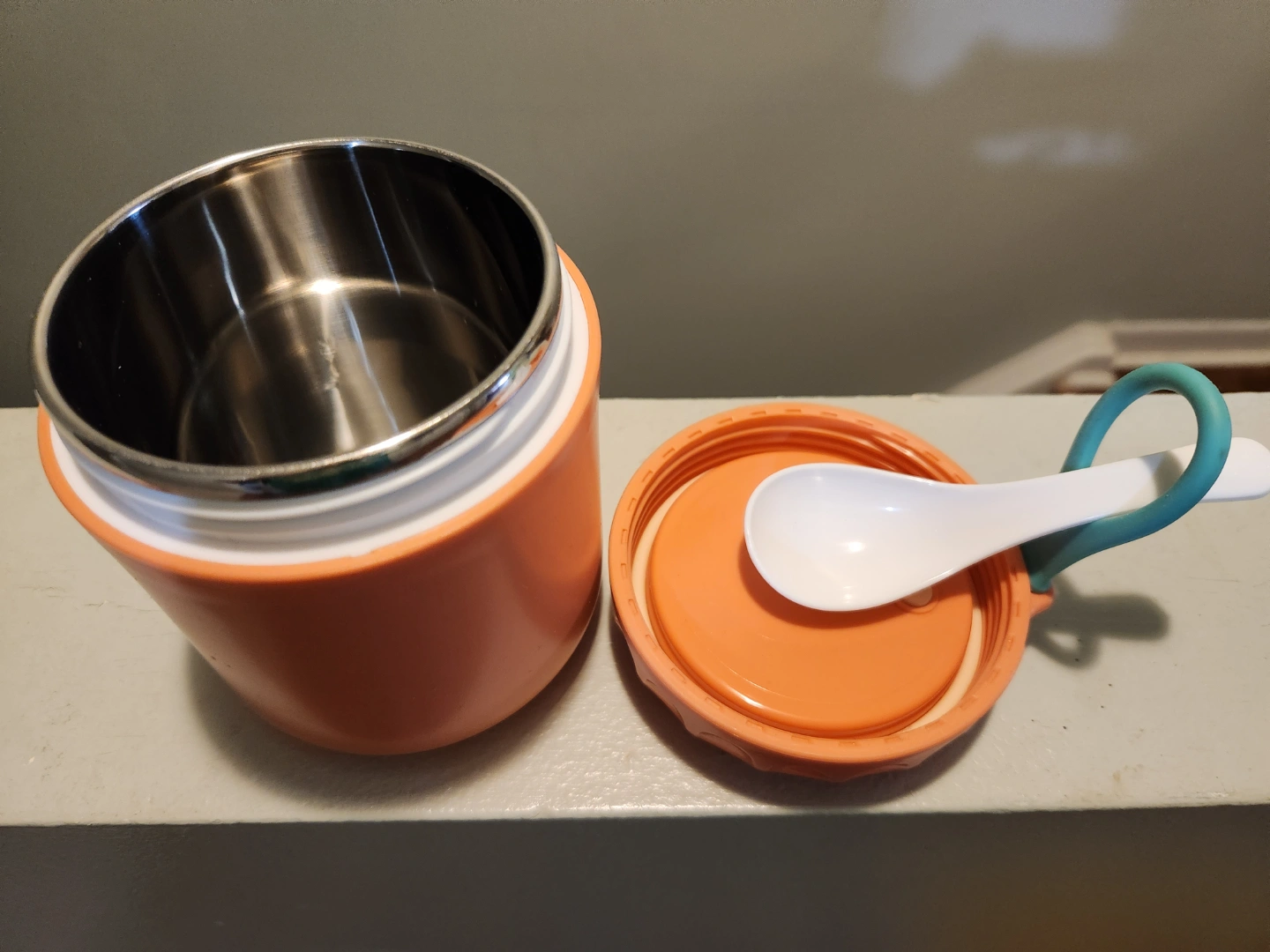 Portable food container. Keeps food warm or cold. Includes a small spoon. Peach coloured exterior. Stainless steel interior. Never use.