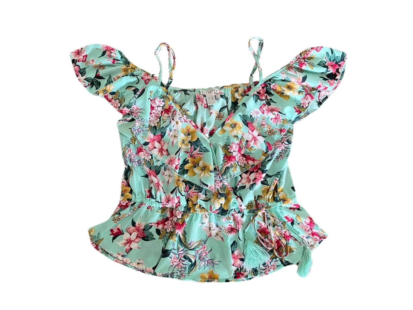 Excellent condition. Adjustable spaghetti straps, v neck, flutter ruffle sleeve. Ruffle continues across the chest and top crosses over on the front. Peplum waist with tassels that tie up on the front. Beautiful light teal with floral print in shades of green, pink and yellow.