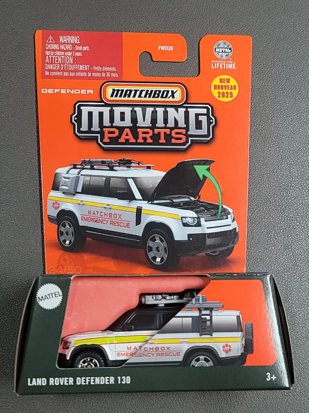 41New 2025 Matchbox Moving Parts diecast. Land Rover Defender 130 Emergency Rescue vehicle. Features moving parts. Collectible item.