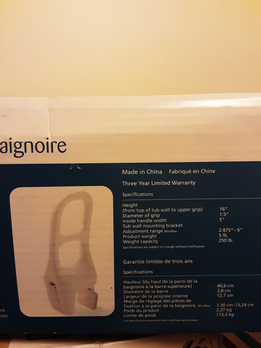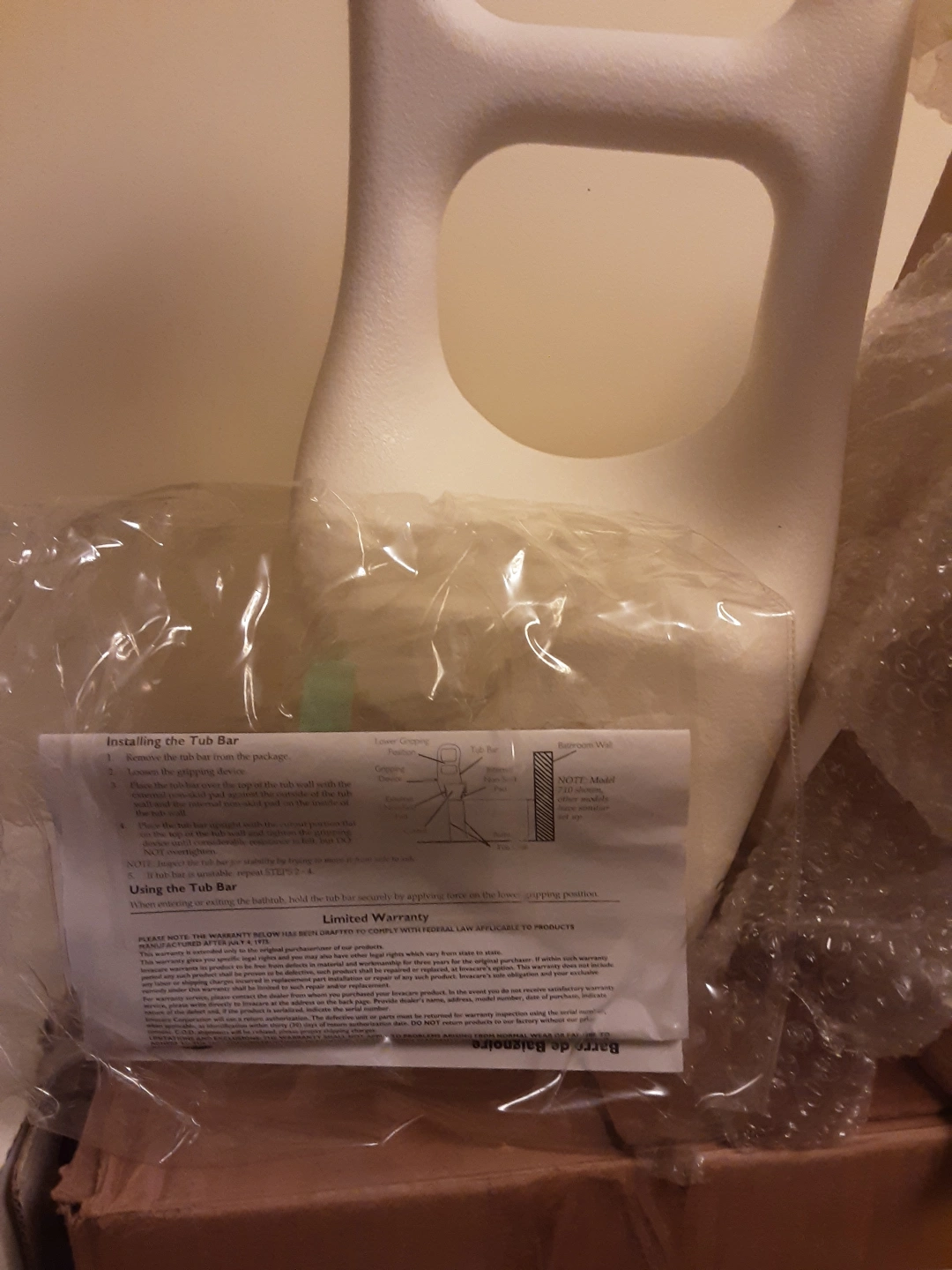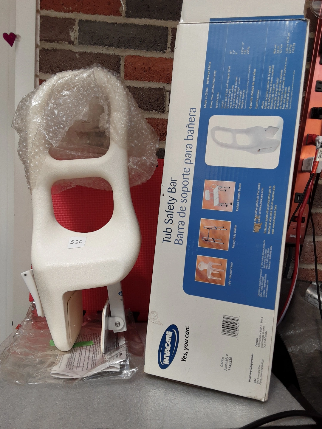 Brand new Invacare tub safety bar. Still in box. Ideal for added safety and stability in the tub or shower. Easy installation. Provides secure grip. No tools needed.
