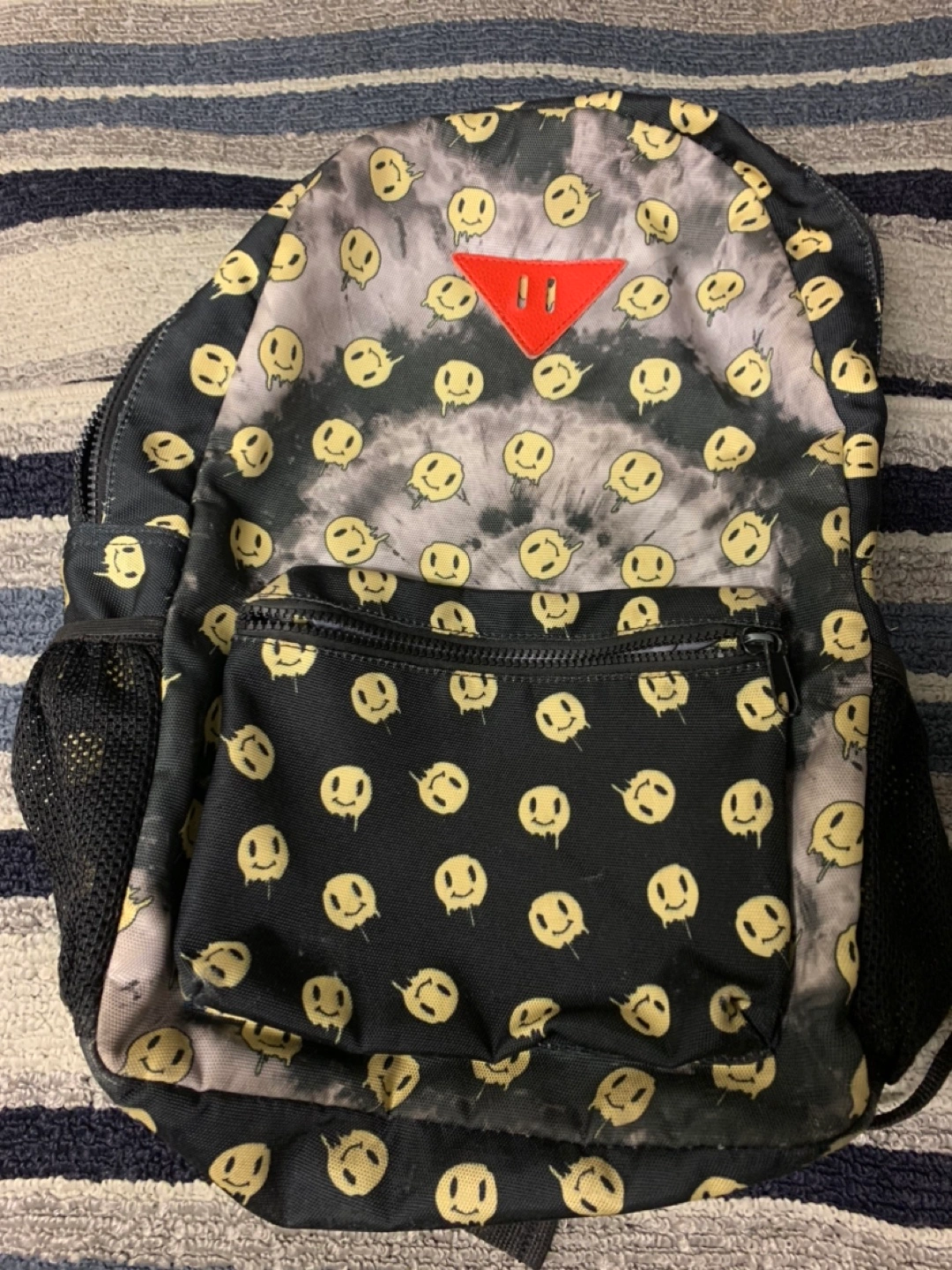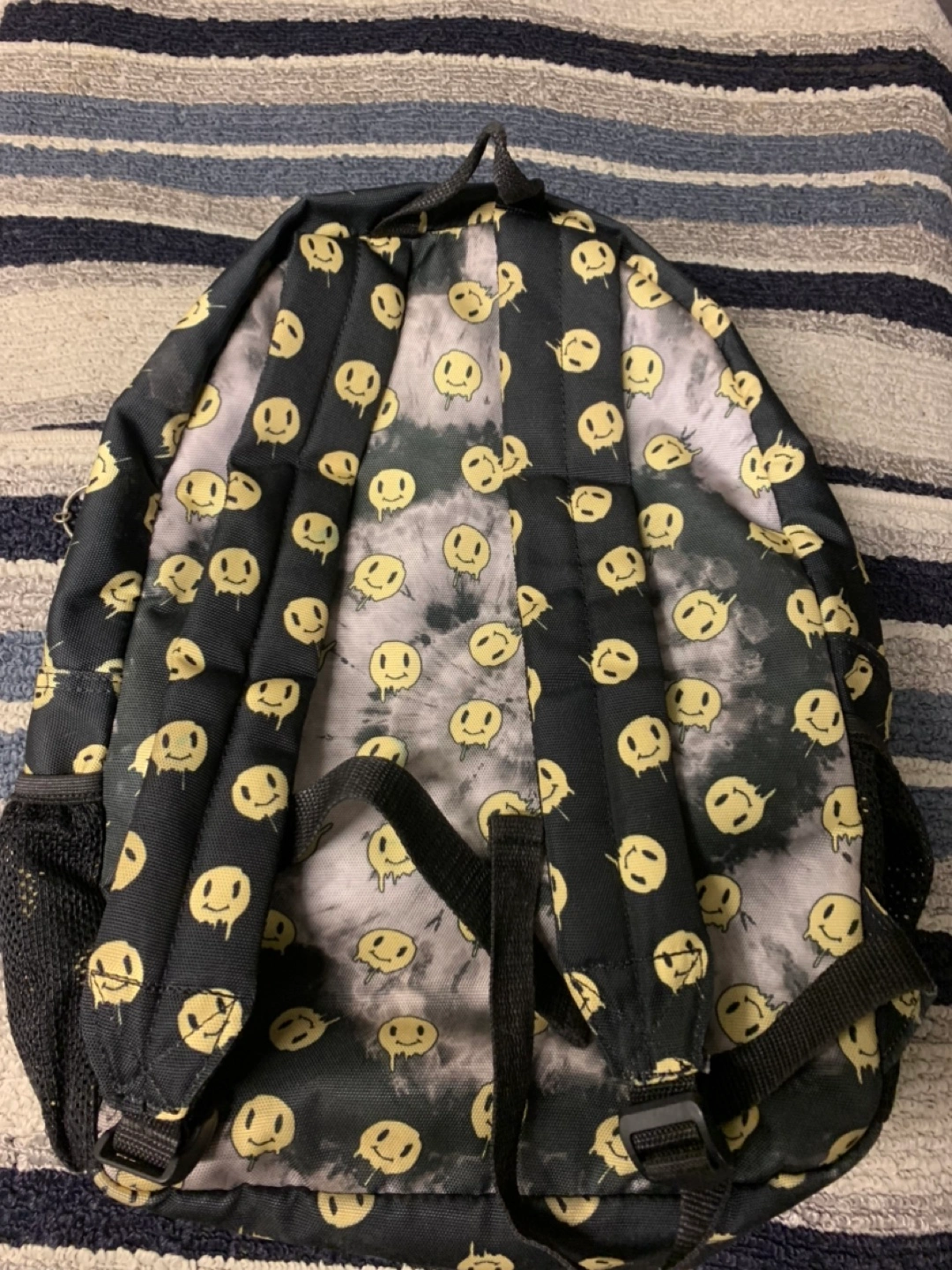 Black backpack with a tie-dye pattern and yellow smiley faces. Features multiple compartments and adjustable straps. Great for school or everyday use.