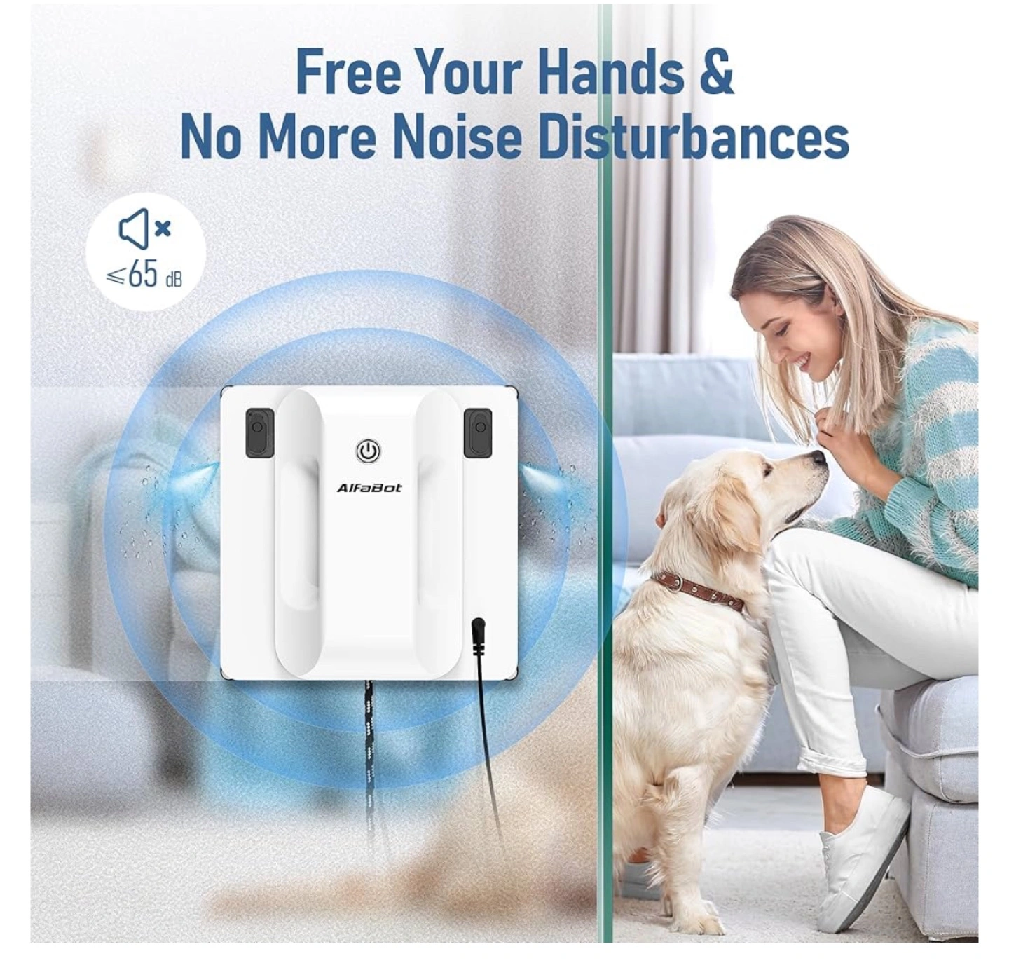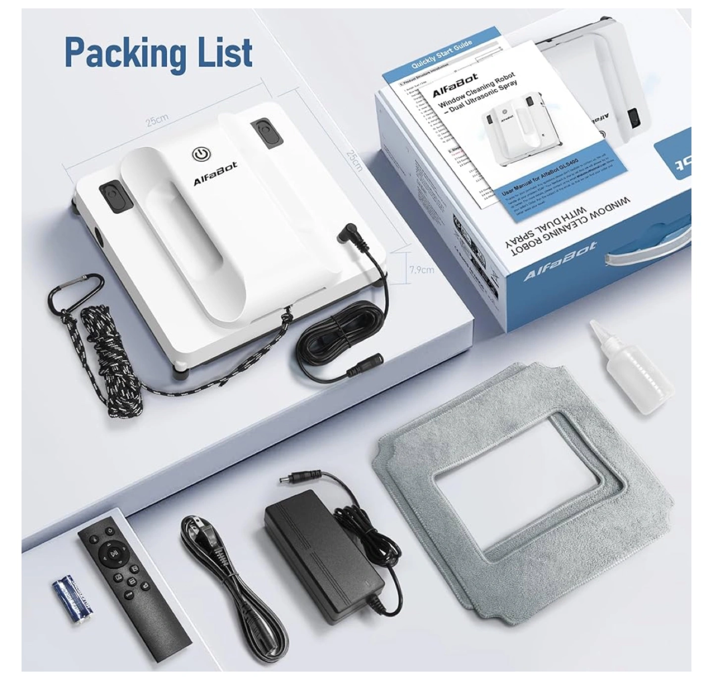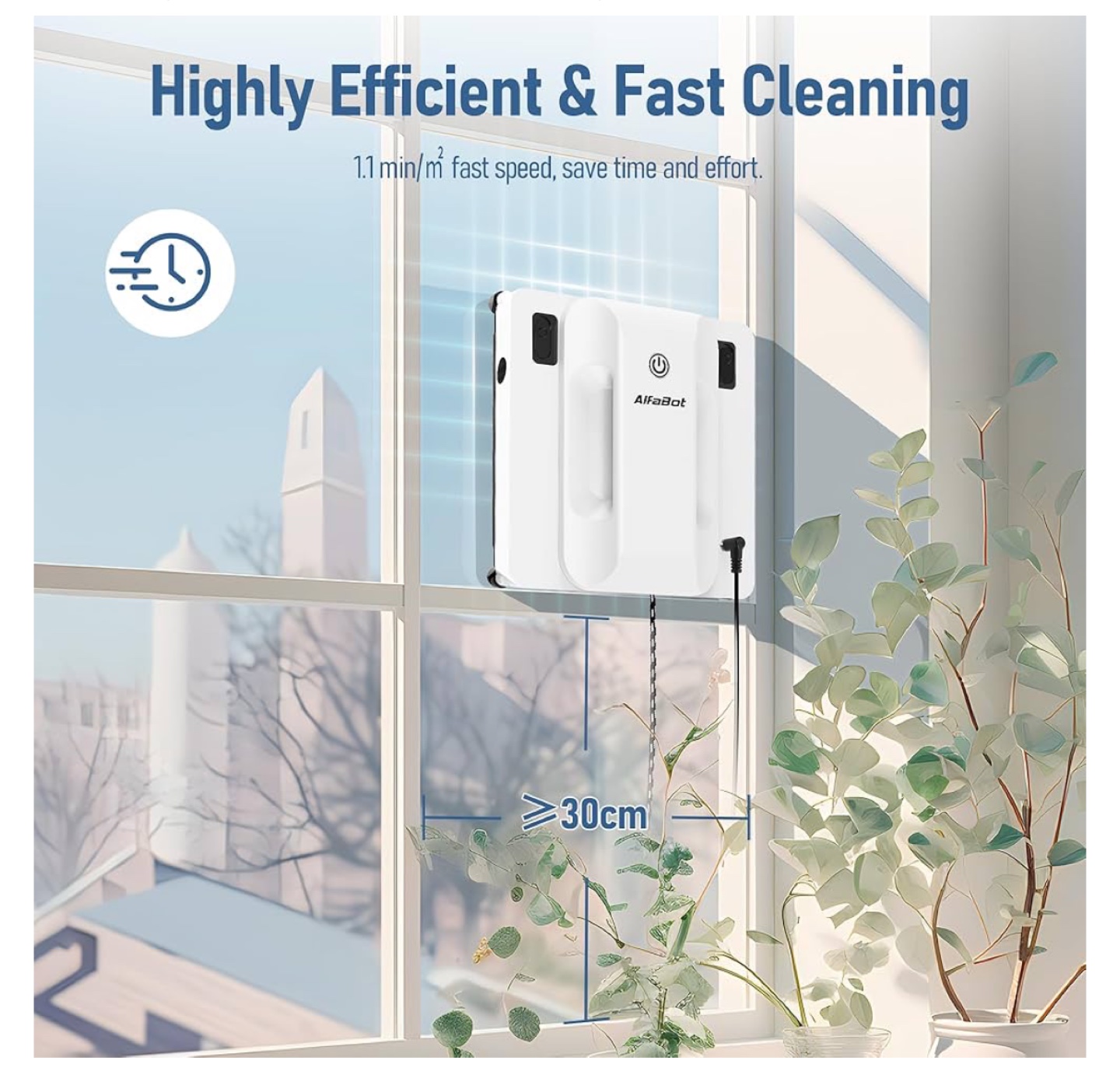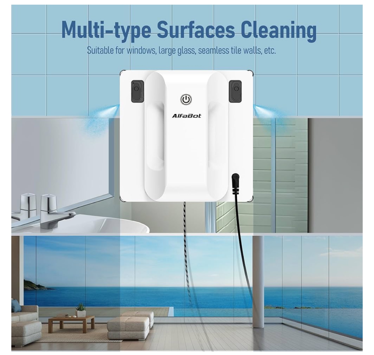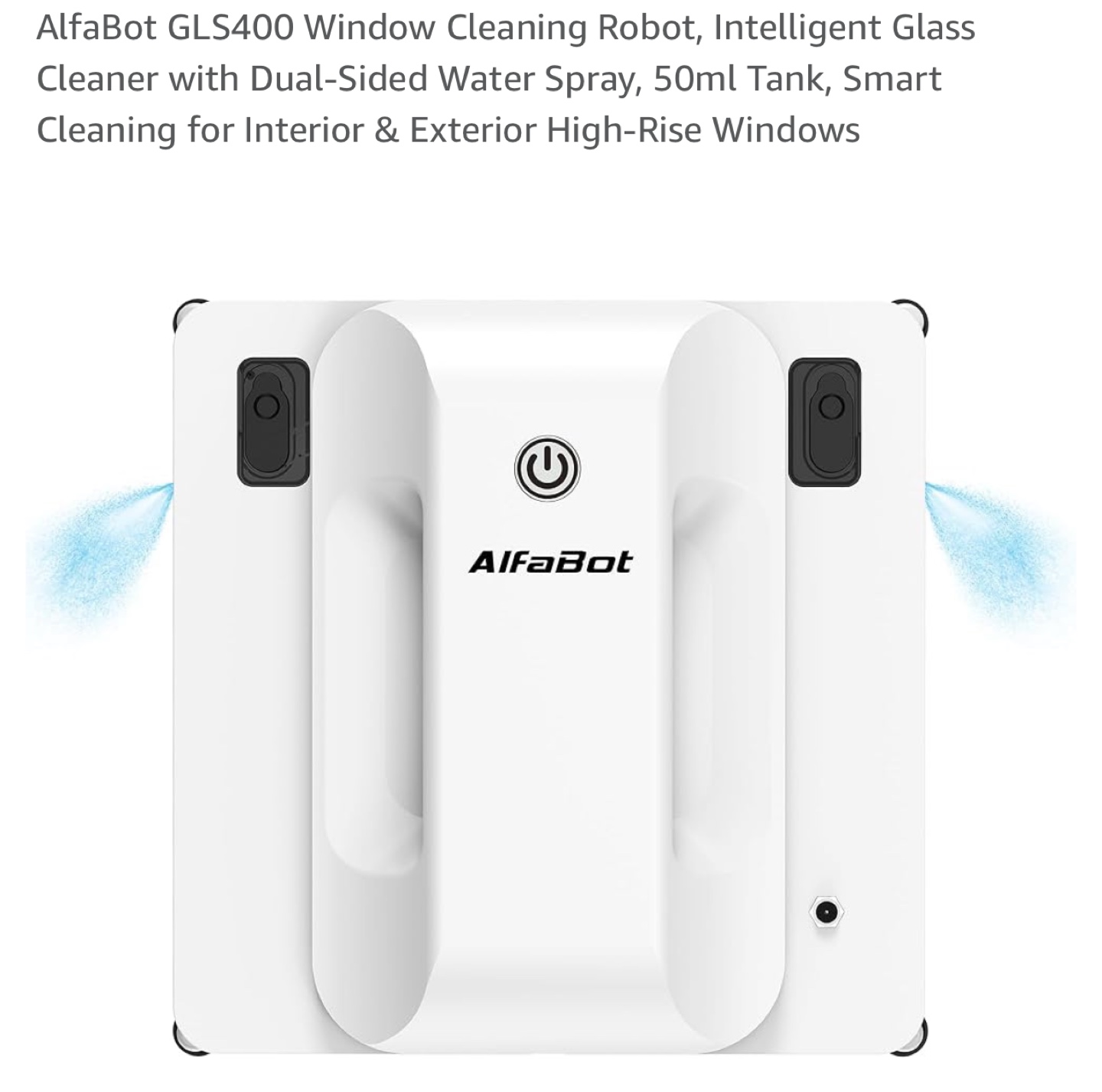 Intelligent glass cleaner. Dual-sided water spray. 50ml tank. Smart cleaning for interior & exterior high-rise windows. Three auto-cleaning modes. Suitable for windows, large glass, seamless tile walls. 11 min/m² fast speed.