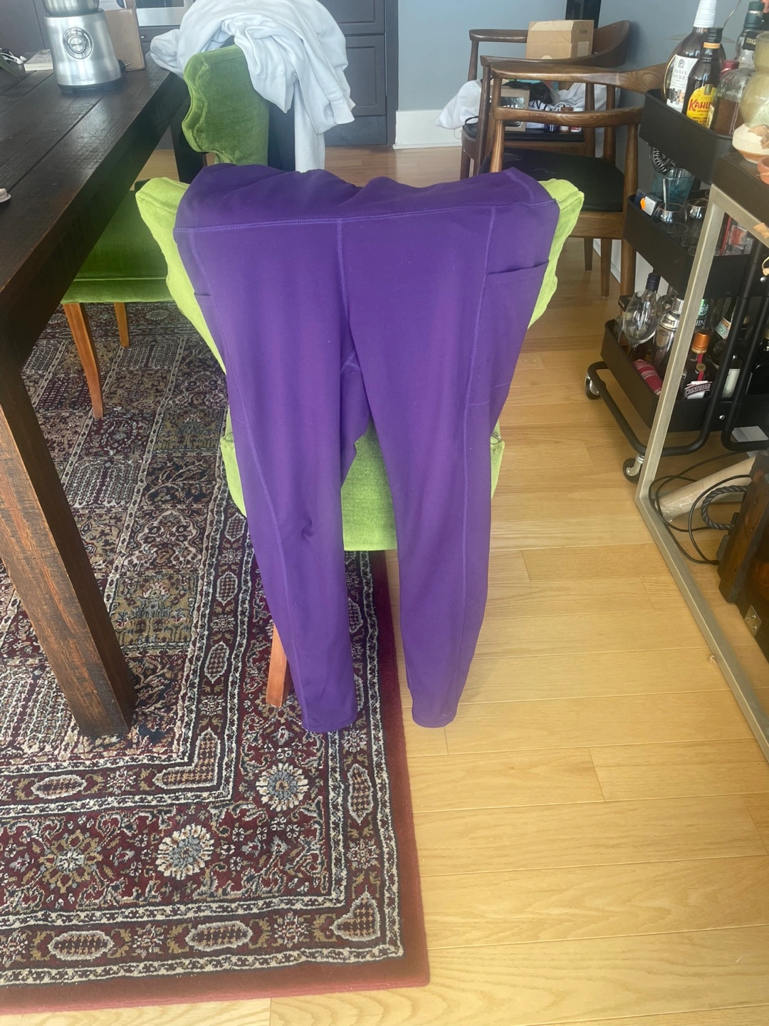 Free Women's purple athletic leggings. Full length. Side pockets + small waistband pocket. Imperfection on one of the knees. Size L/XL. Unknown brand. Comes from a home with a dog.