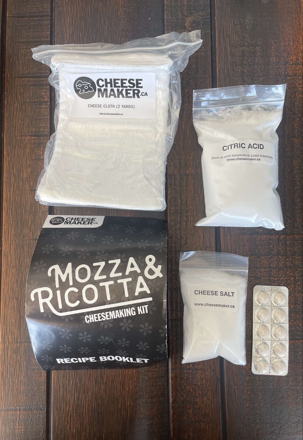 cheesemaking kit. Includes cheese cloth, citric acid, cheese salt, and recipe booklet. Makes mozzarella and ricotta cheese. Also has rennet tablets, but this kit is 3 years old and stored at room temp, so I’m not sure if they would still be good. The rest of the items are perfectly good.