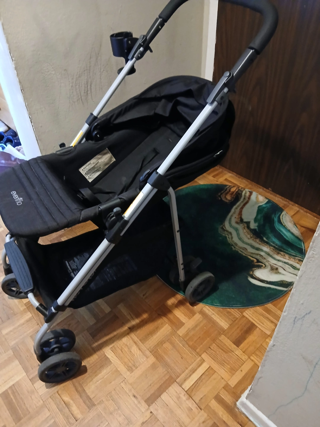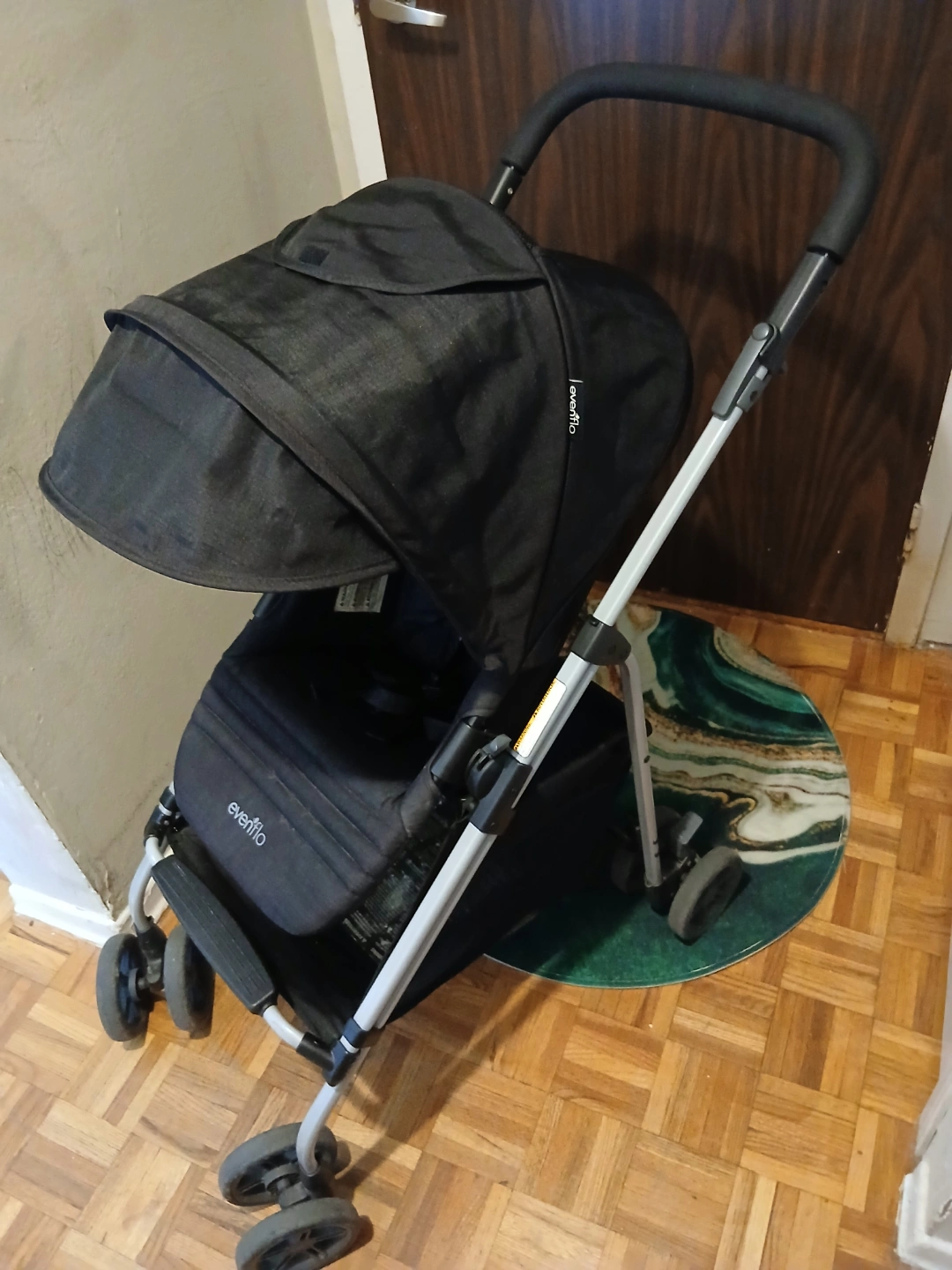 Lightweight stroller, black fabric. Features include cup holder. Folds easily. Reversis front and back facing. Carrying weight in basket well. Three reclining stages for resting and alert. pull and press mechanism folds easily and kick helps setup on the bar beneath.