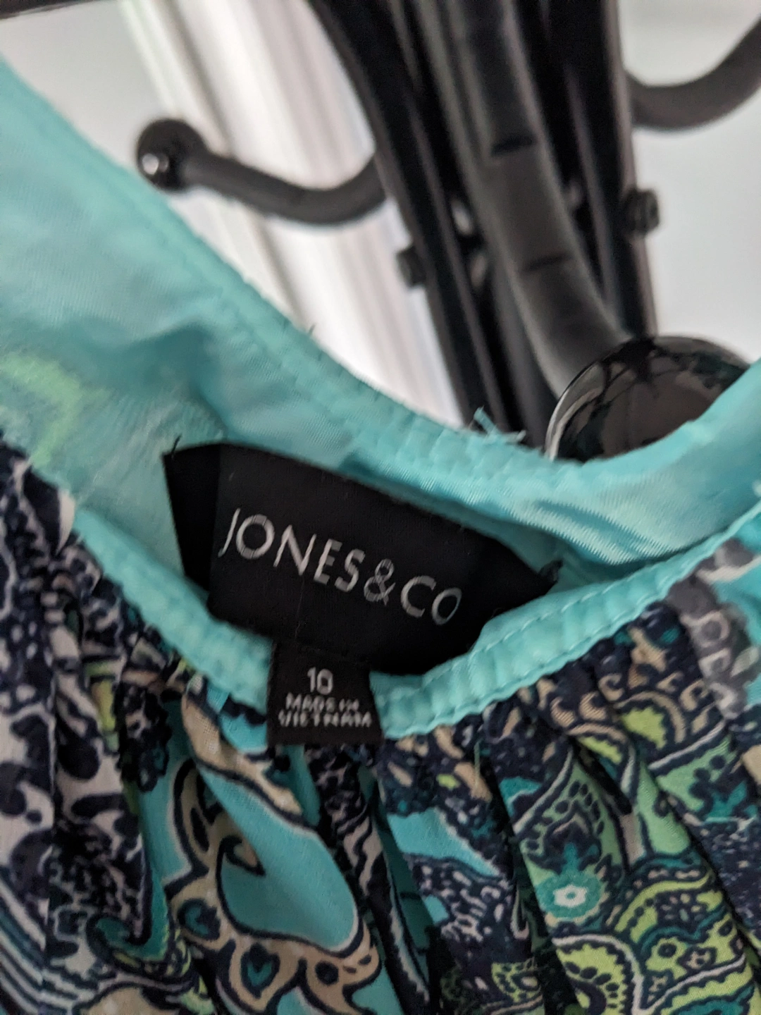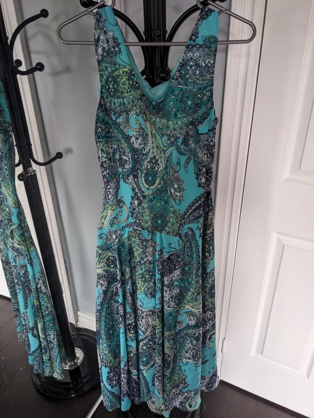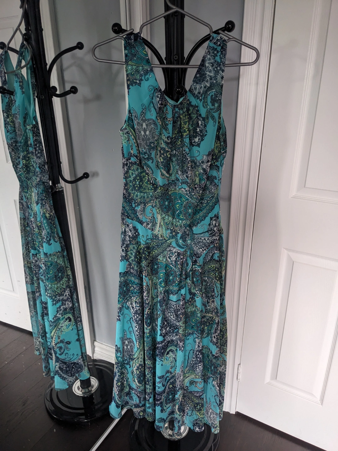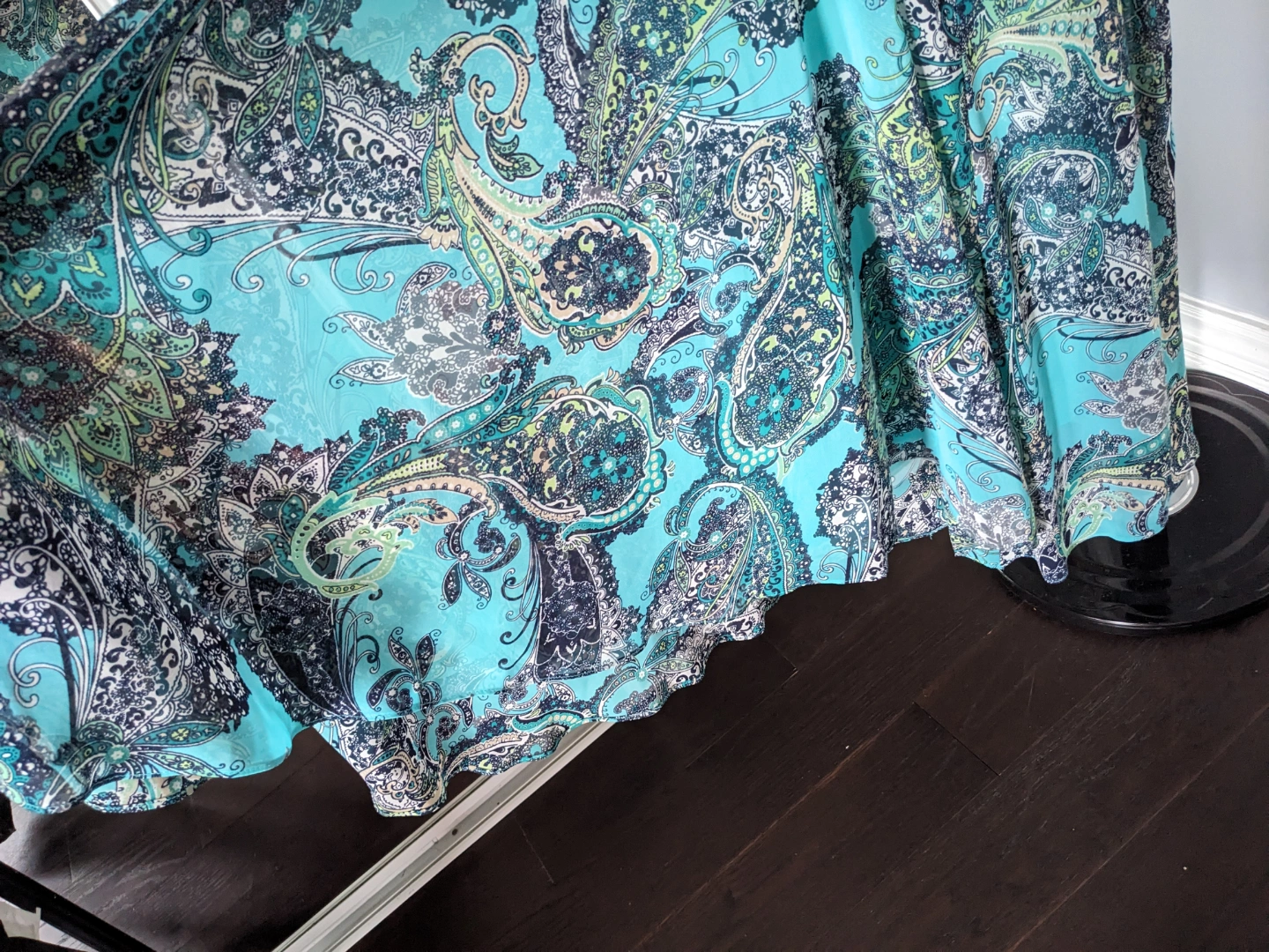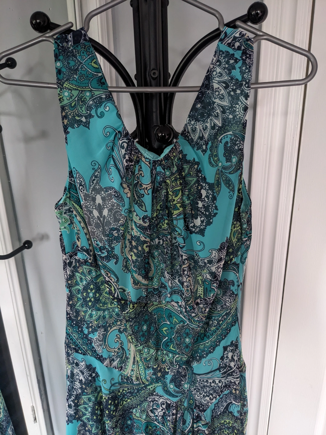 Beautiful teal maxi dress. Asymmetrical design. Features a paisley print and sleeveless design. Flowy and comfortable. Size 10.