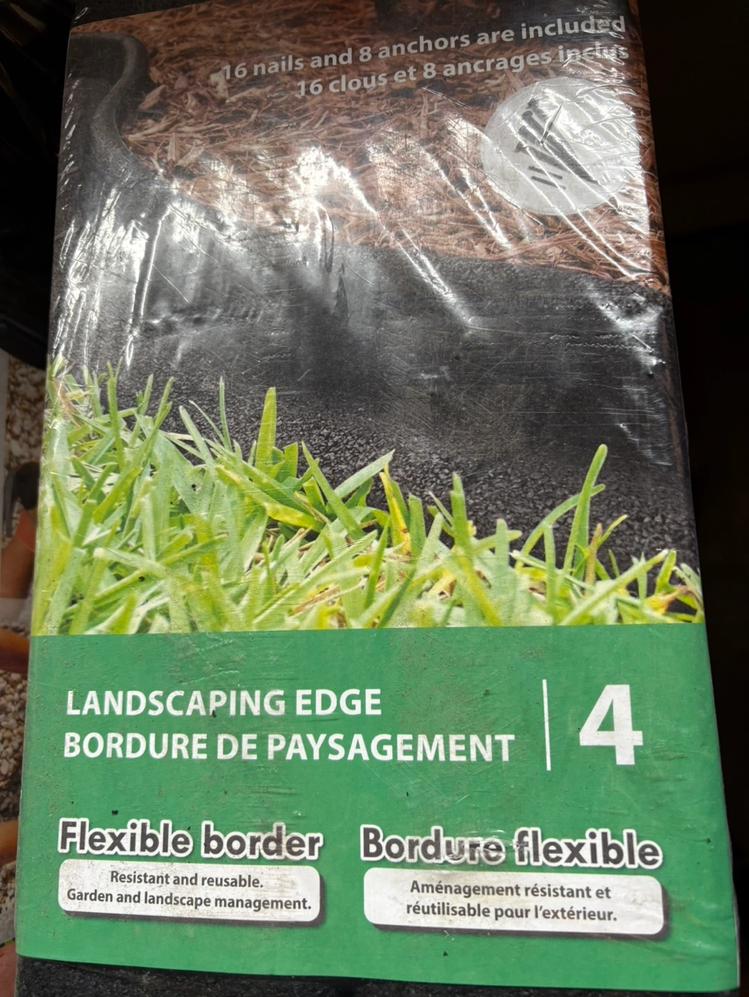 Three New packs of flexible landscaping border. 4 borders per pack. Reusable and resistant. Quick installation. Includes 16 nails and 8 anchors per pack. Garden and landscape management.