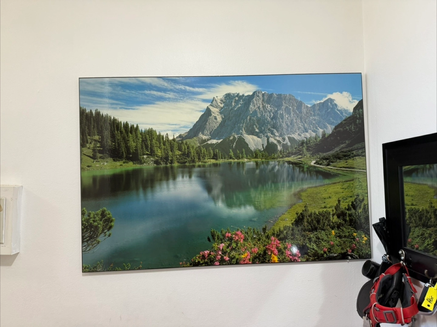 Stunning landscape print. Features a serene mountain lake scene. Ready to hang. Great addition to any room. 90cm by 60cm Smoke free home