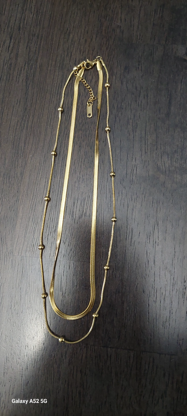 Two gold plated necklaces. One features a snake chain, the other has small beads. Both are layered. Clasp closure.