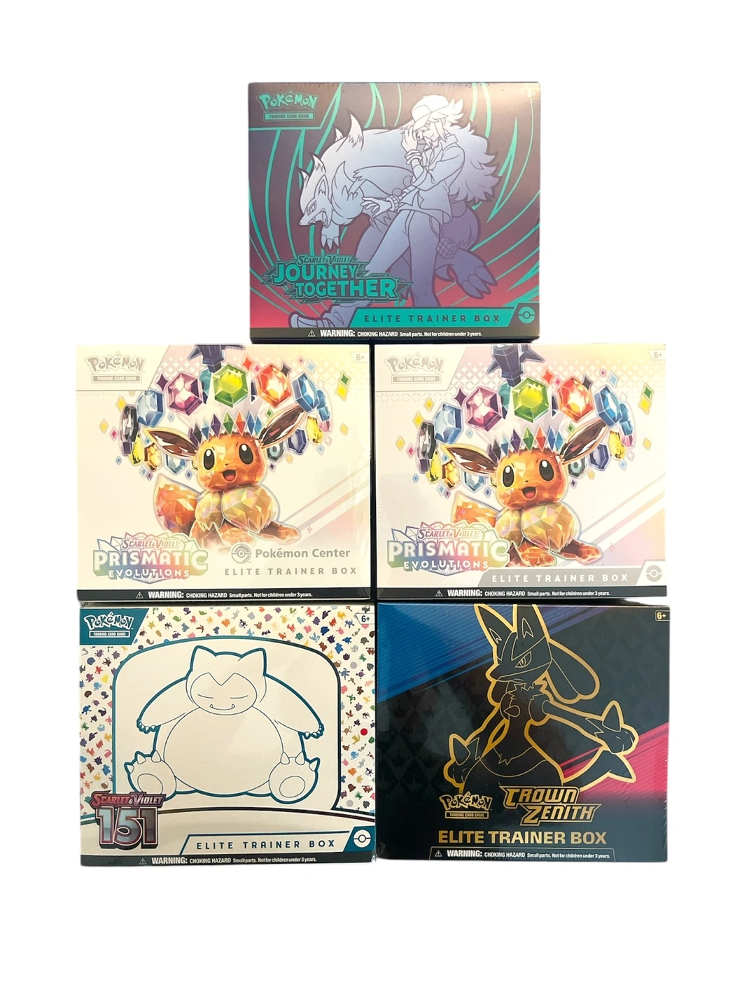 Pokemon Elite Trainer Boxes Journey Together - 100 Prismatic Evolutions - 180, 400 (PC) 151 - 250 Crown Zenith - 185 Msg me if you are interested