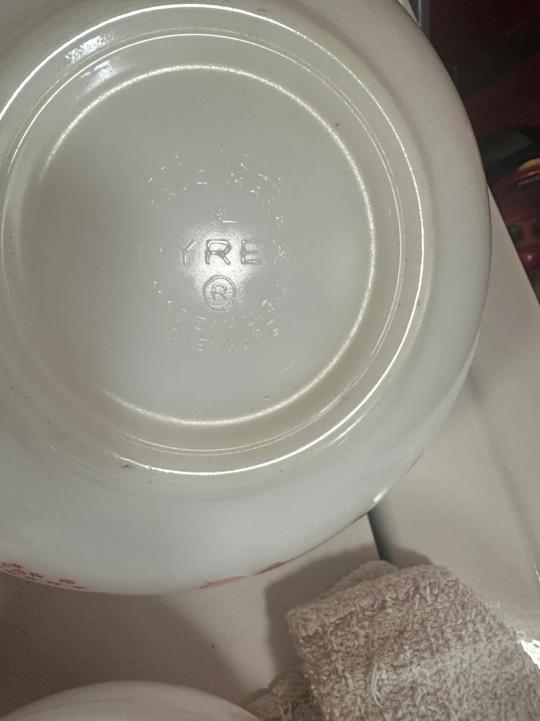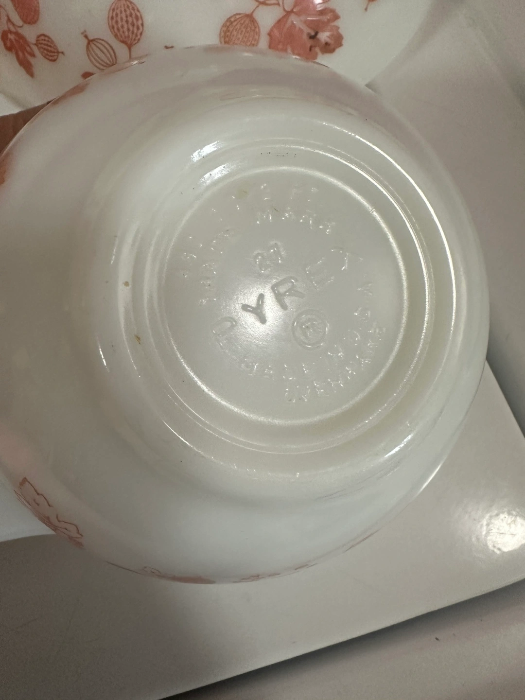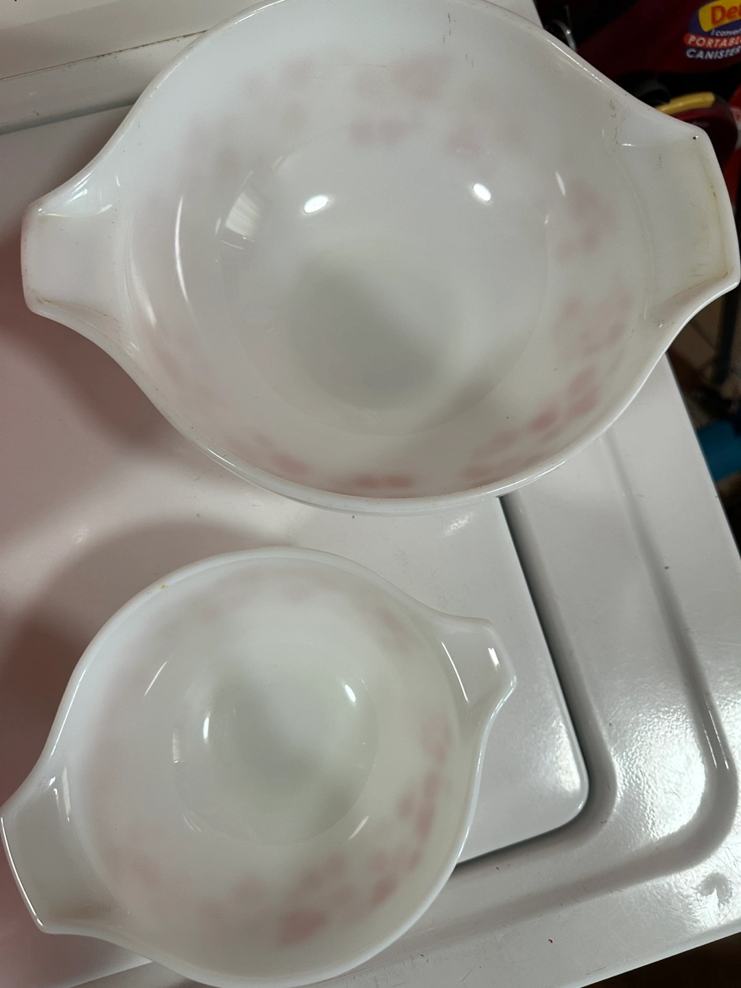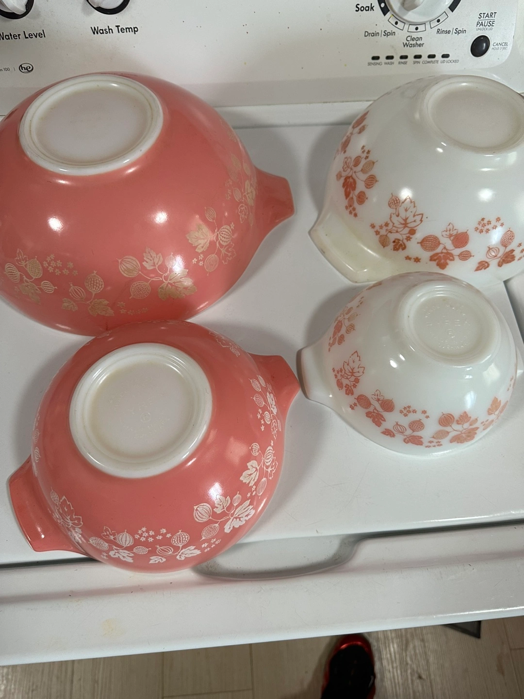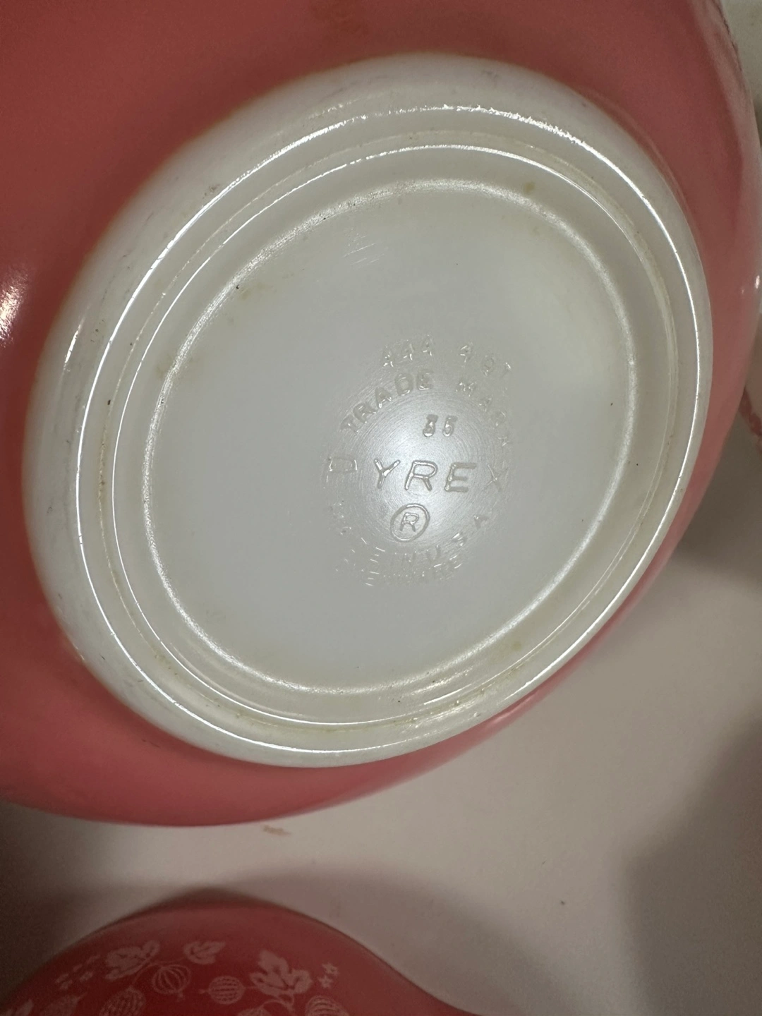 Set of 4 vintage PYREX cinderella 441 442 443 444 mixing bowls. 2 pink bowls and 2 white bowls. Gooseberry pattern. Nice addition to any kitchen.PYREX original capital letters Bronx ny price negotiable no cracks no chips like new not stained