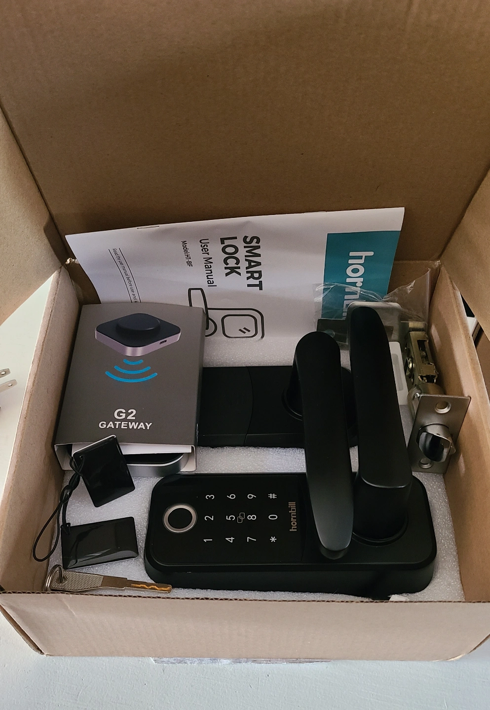 Black smart door lock. Fingerprint scanner, keypad, and app control. Includes two key fobs and keys.