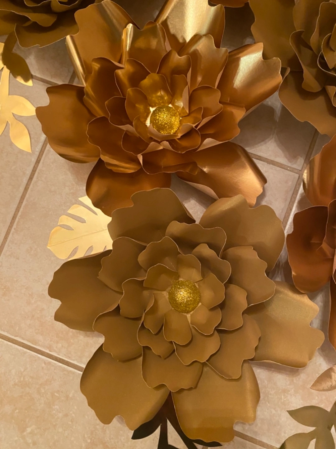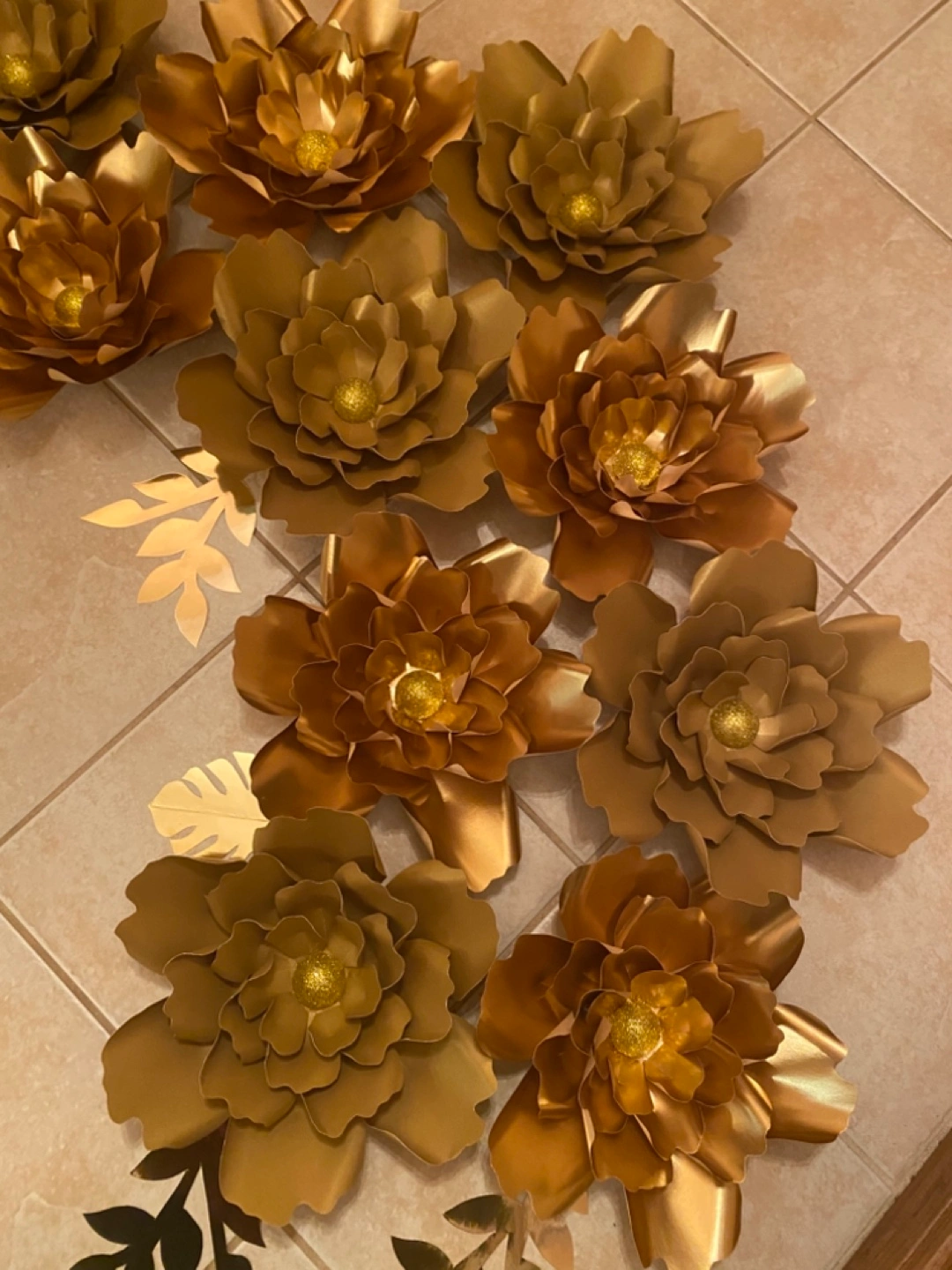 large gold paper flowers. Perfect for weddings, anniversaries or other special events. Glitter centres. Includes coordinating leaves. Customization of sizes and colours is available
