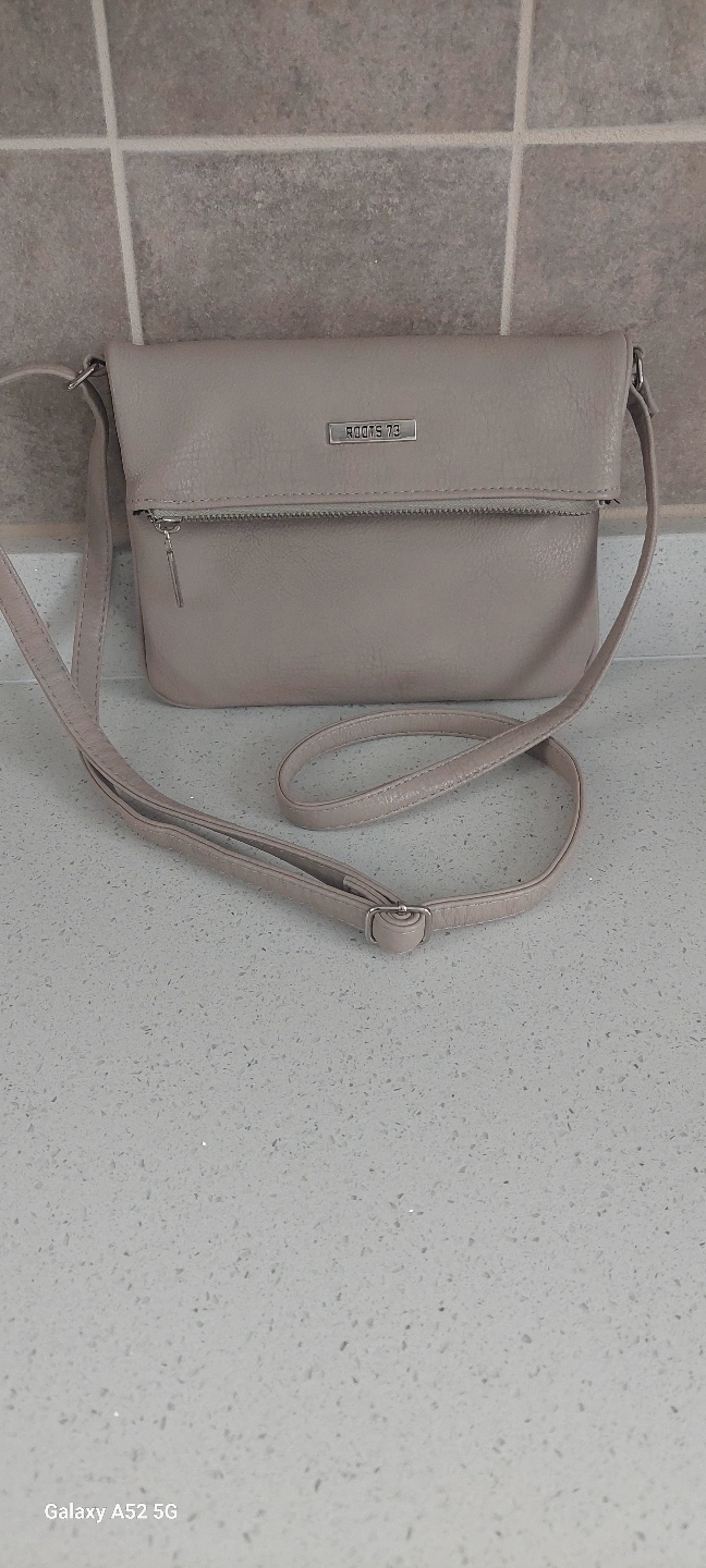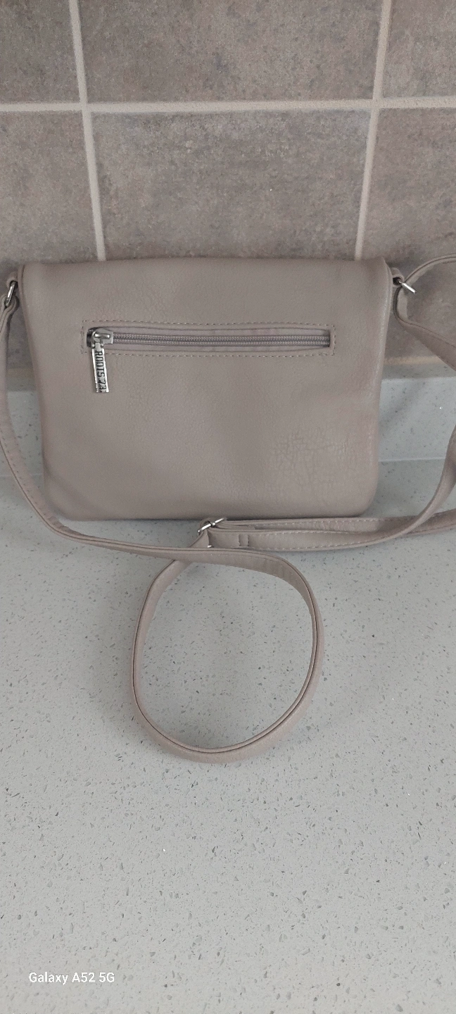 Small taupe crossbody bag. Features a zip closure and adjustable strap. Multiple compartments inside. Great for everyday use.