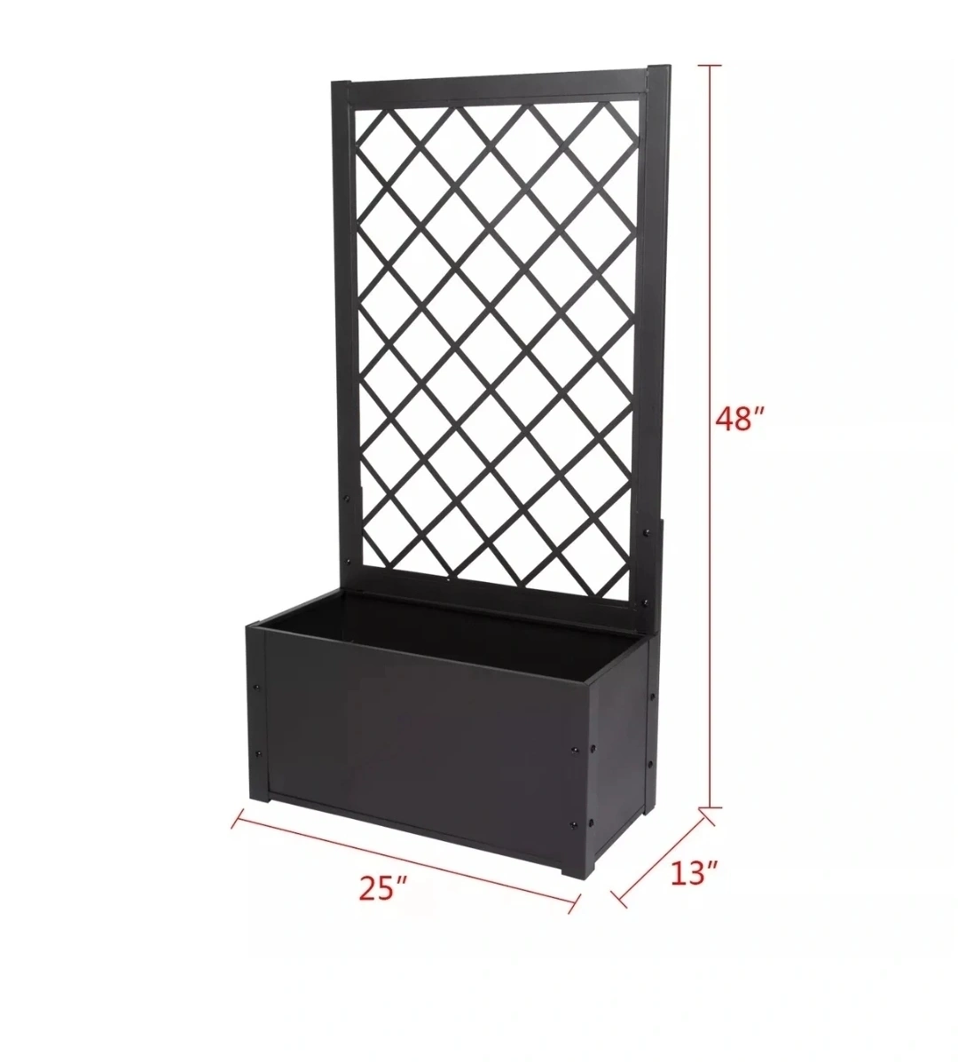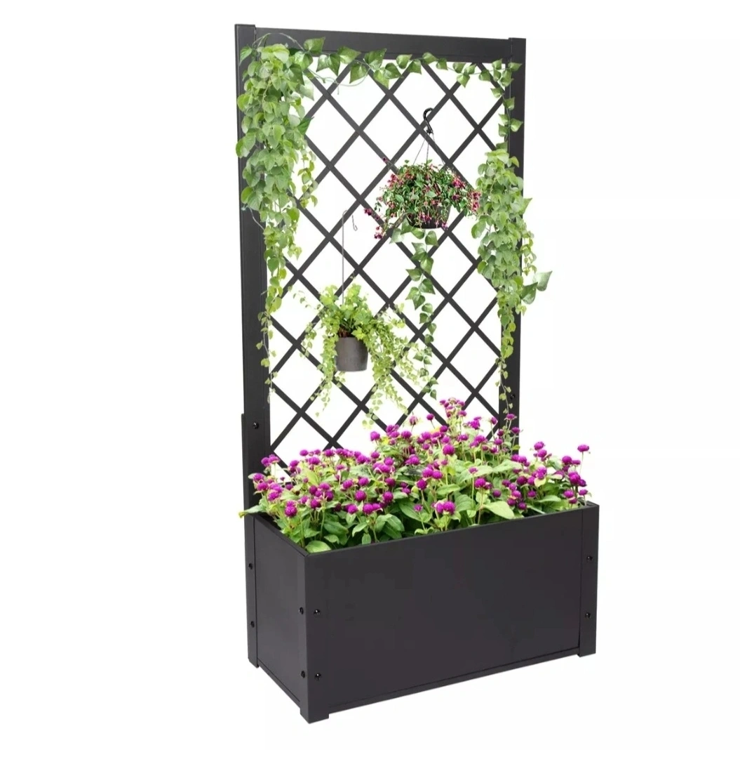 Black metal planter box with integrated trellis. Great for climbing plants and flowers. Features a spacious planter and a sturdy trellis design. Perfect for adding vertical interest to your garden.