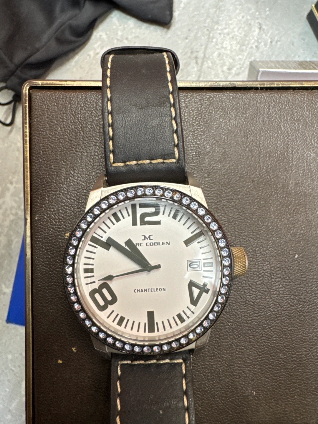 121Women's wristwatch. Brown leather band. Silver face with crystals. Quartz movement.