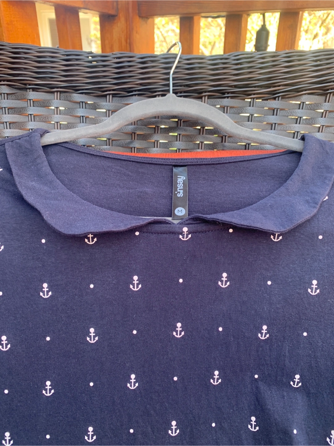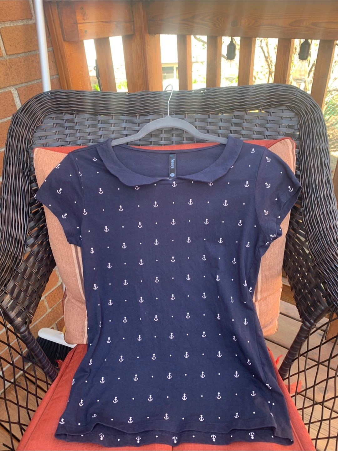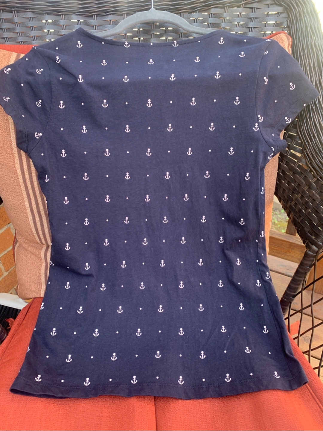 Nautical vibes with this cute navy blue shirt. Features a collared neckline and an all-over anchor and polka dot print. Made of 100% cotton. Size medium. Perfect for the spring /summer season with white jeans or a skirt. Ahoy mate! Cash only please!