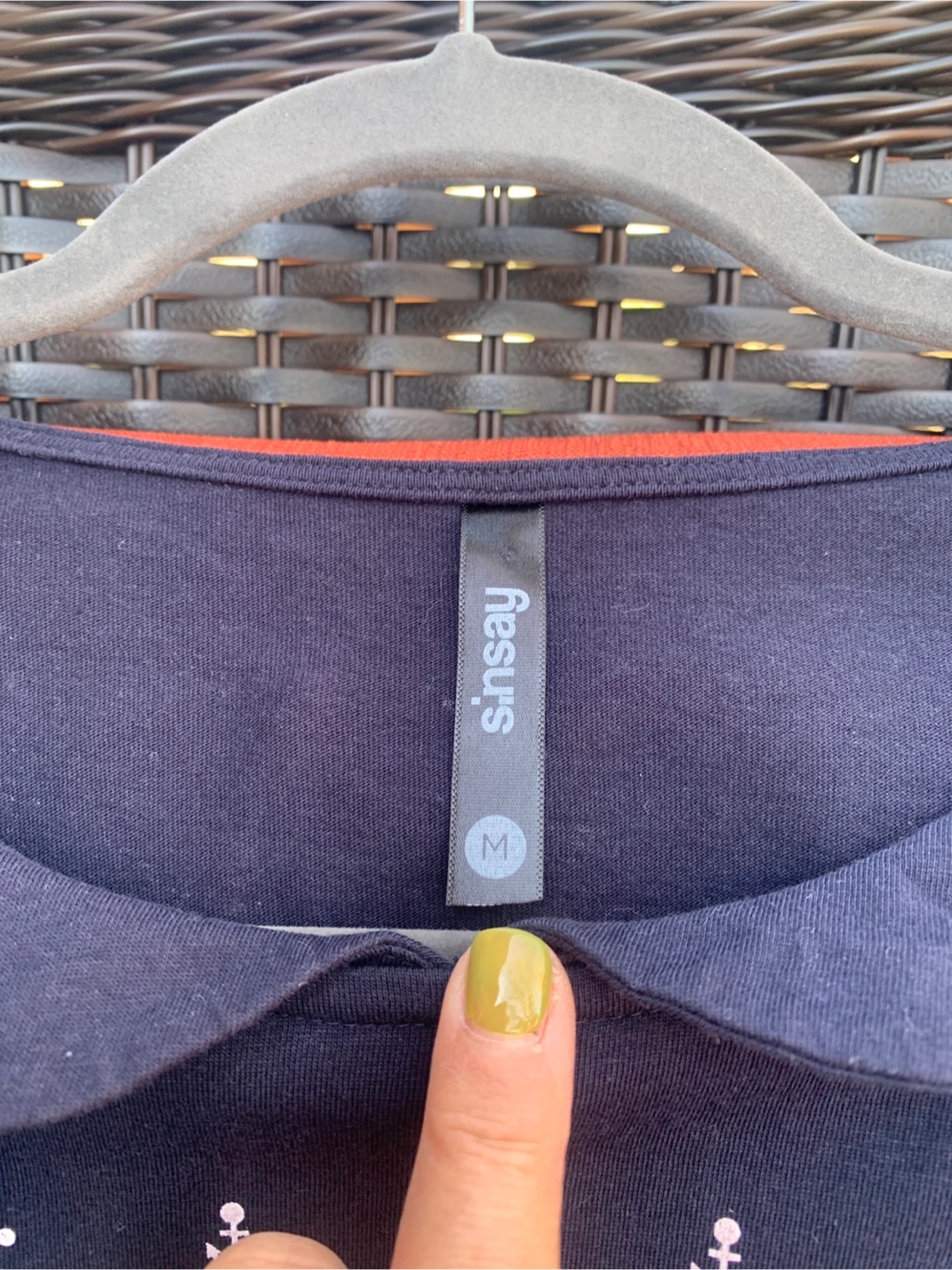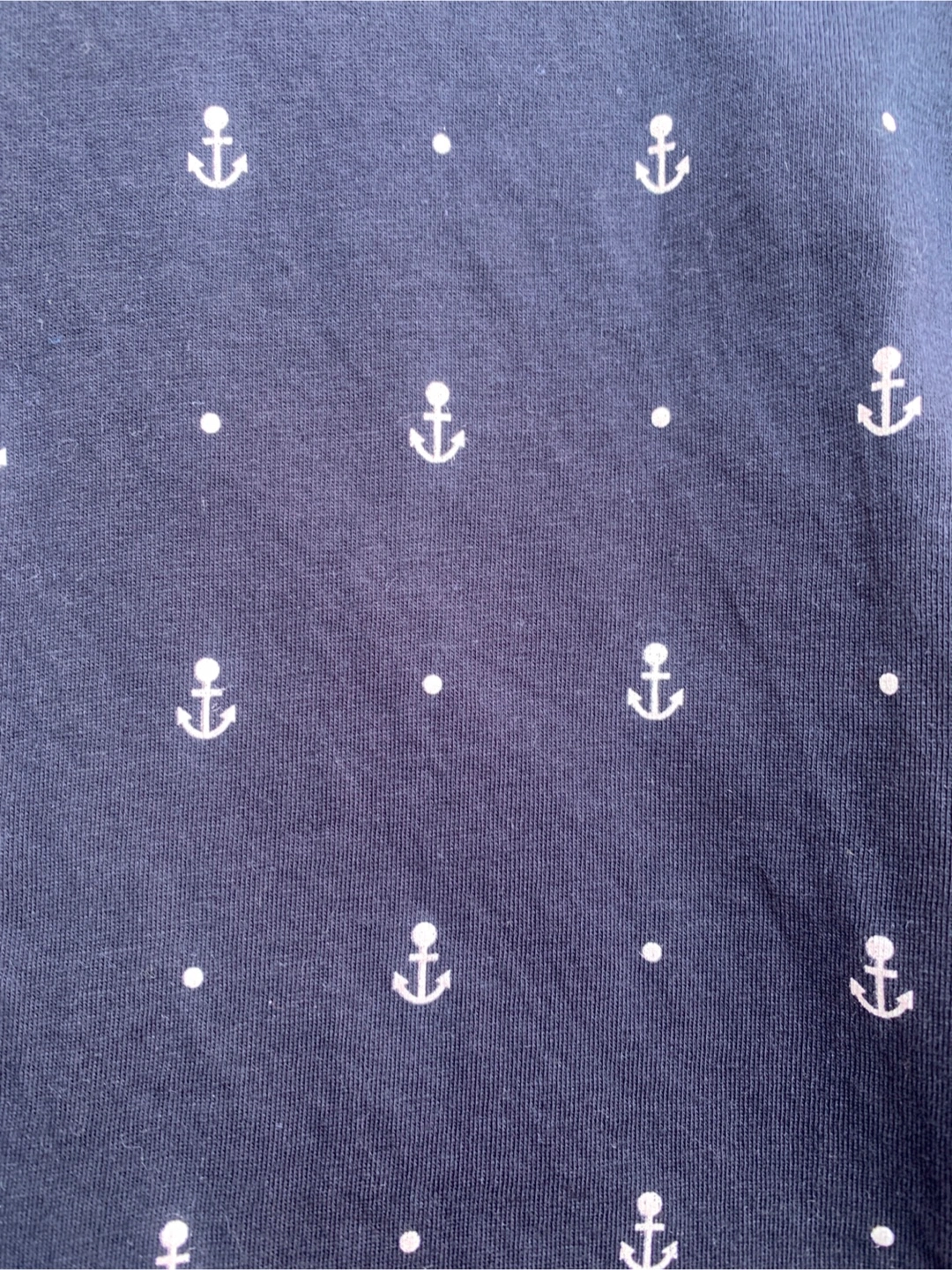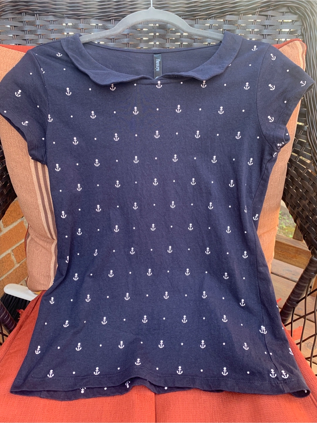 Nautical vibes with this cute navy blue shirt. Features a collared neckline and an all-over anchor and polka dot print. Made of 100% cotton. Size medium. Perfect for the spring /summer season with white jeans or a skirt. Ahoy mate! Cash only please!