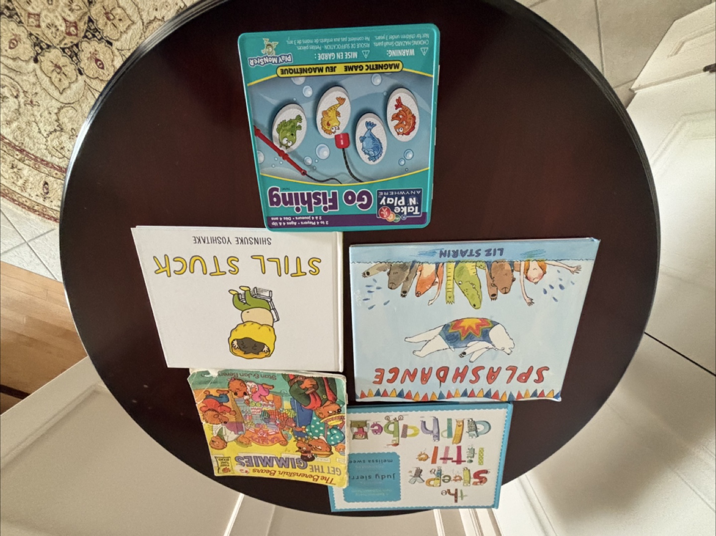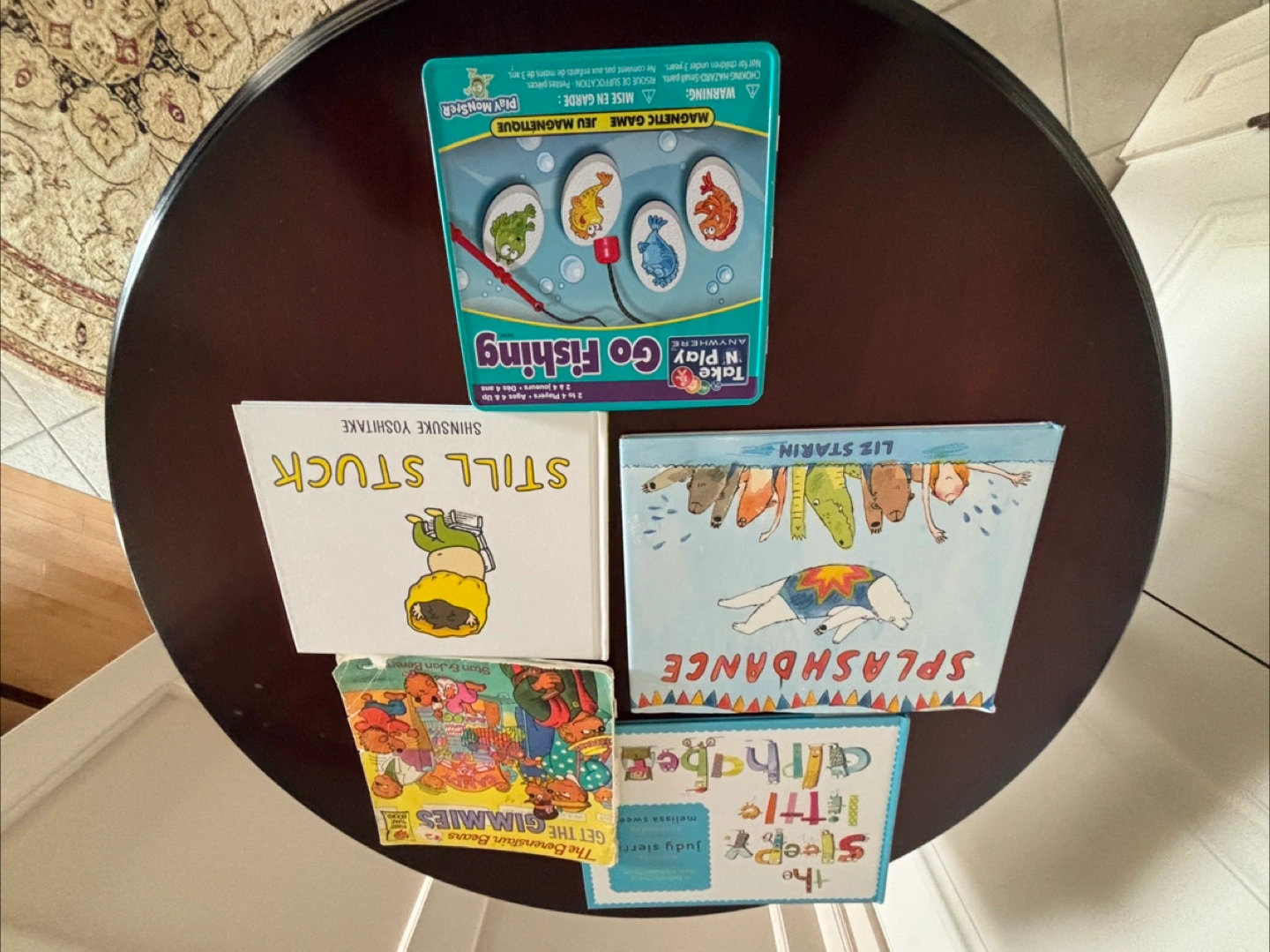 Bundle includes four children's books and one magnetic fishing game. Titles include *Still Stuck*, *Splashdance*, *The Sleep-Tight Alphabet*, and *Get the Gimmes*. Game is Go Fishing by Play Monster.