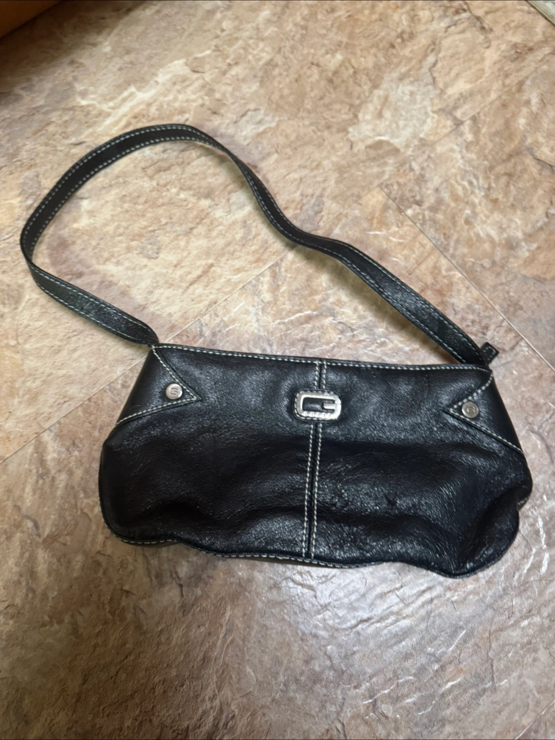 Small black leather shoulder bag. Features a silver Guess logo and white stitching. Simple design, perfect for everyday use.
