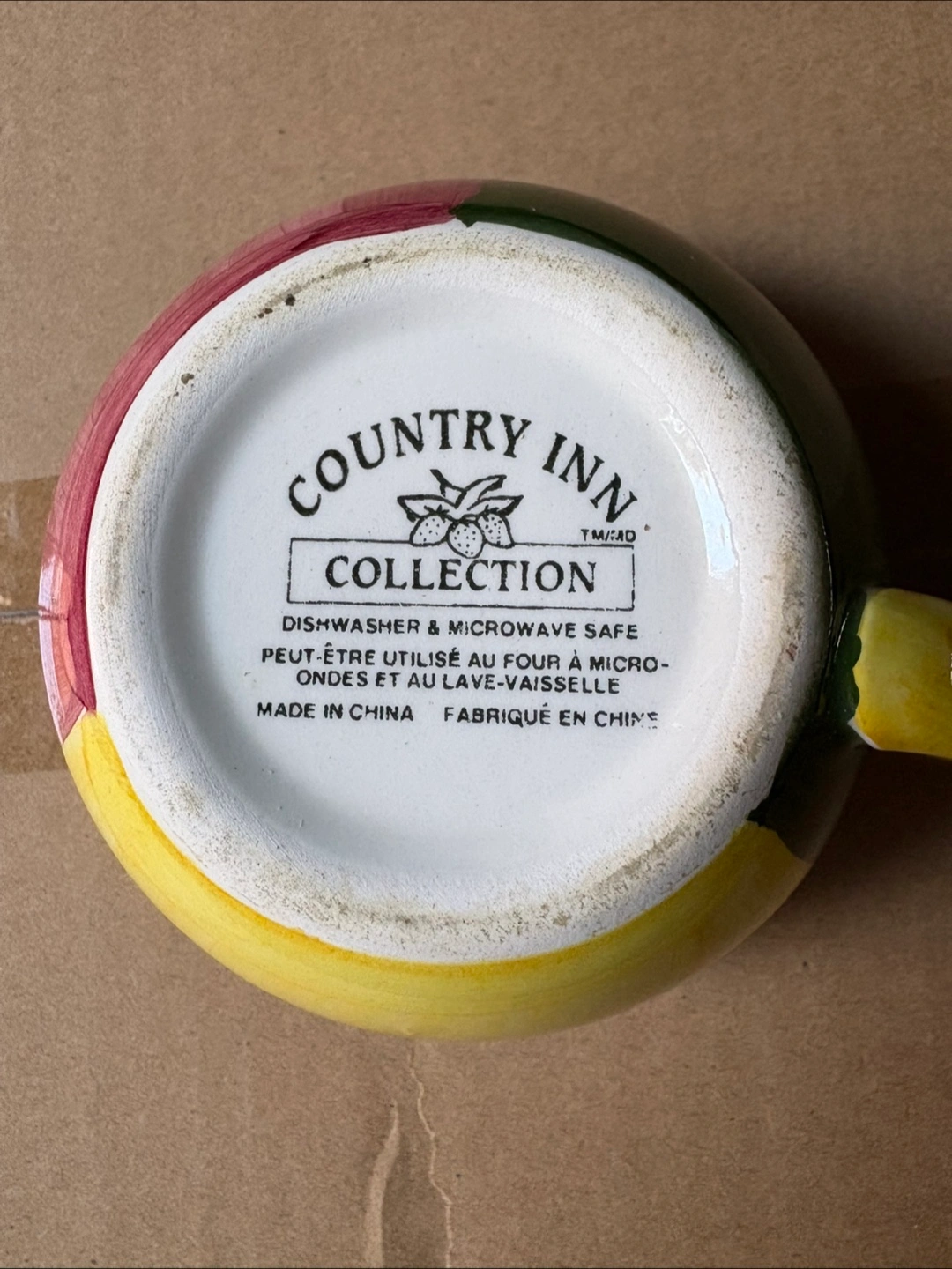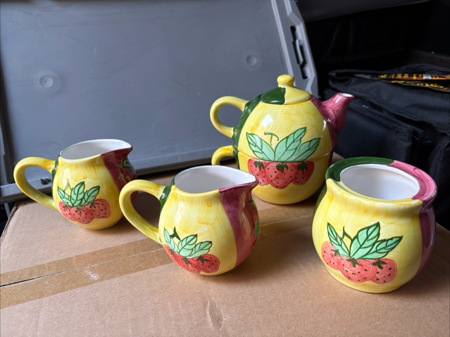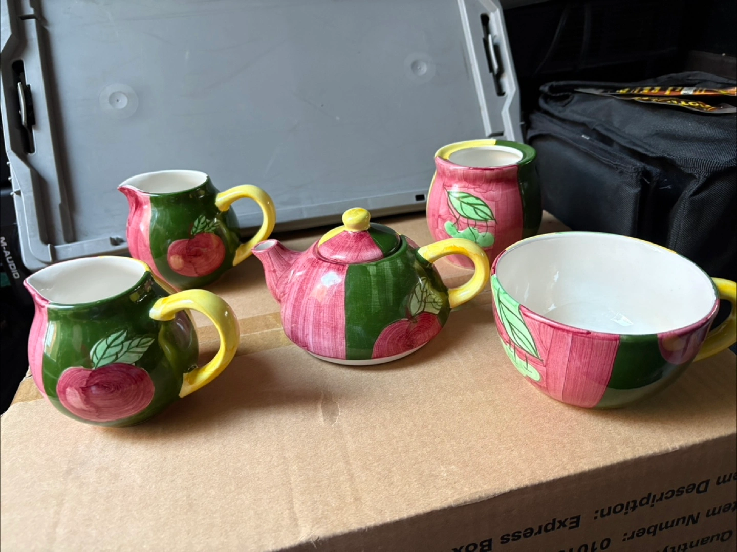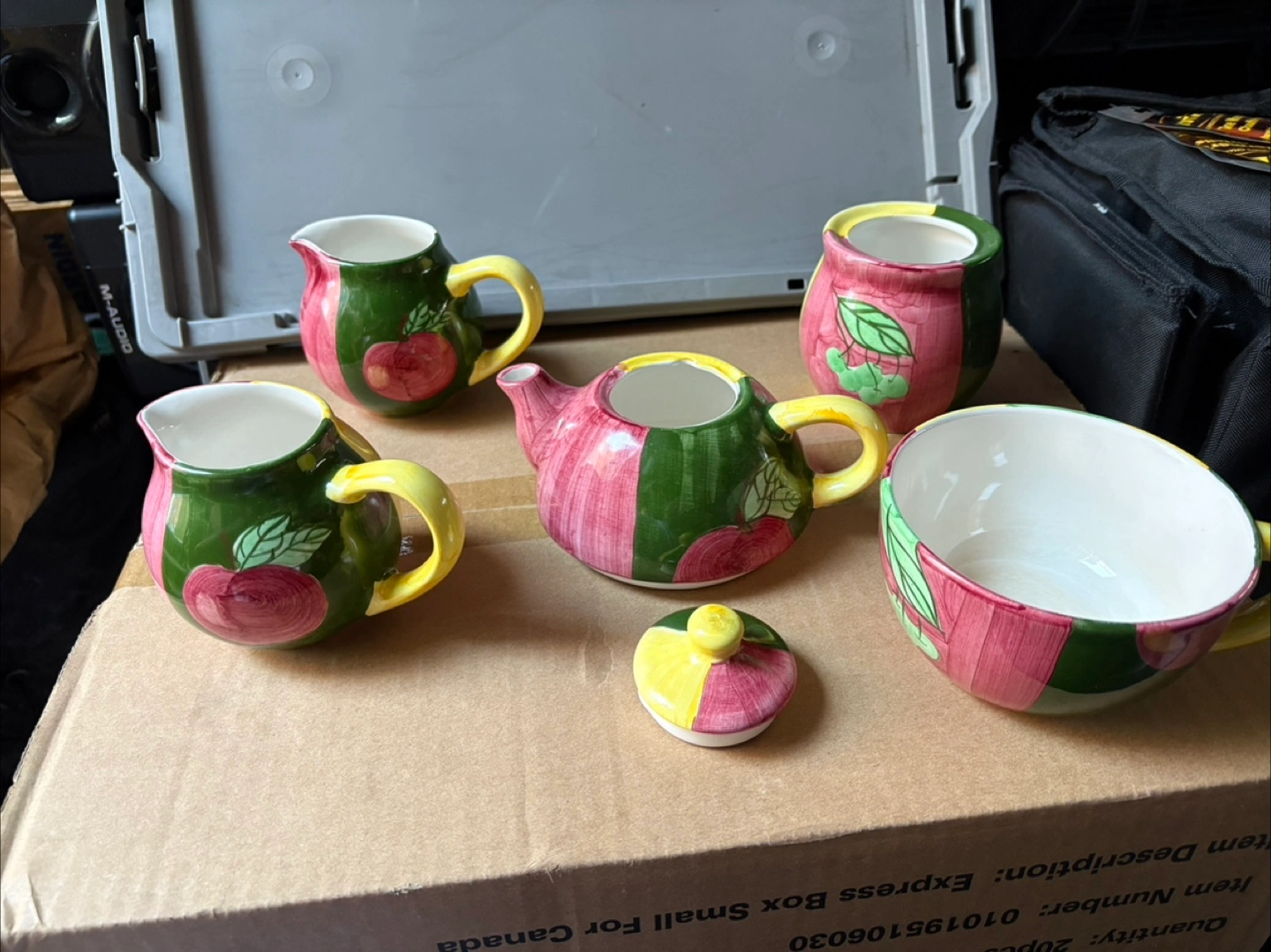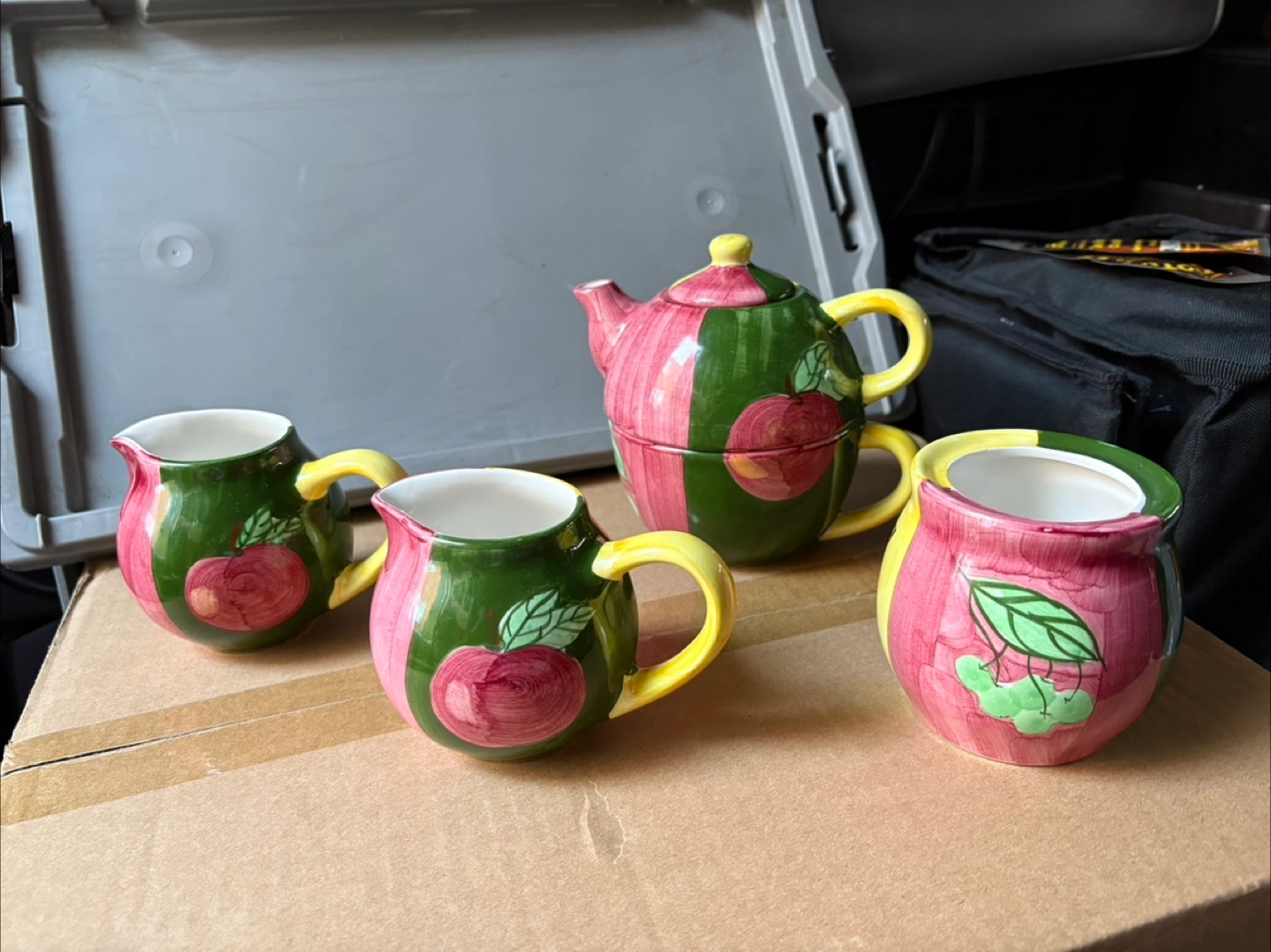 Adorable tea set. Features apples and strawberries. Microwave and dishwasher safe. Made in China.