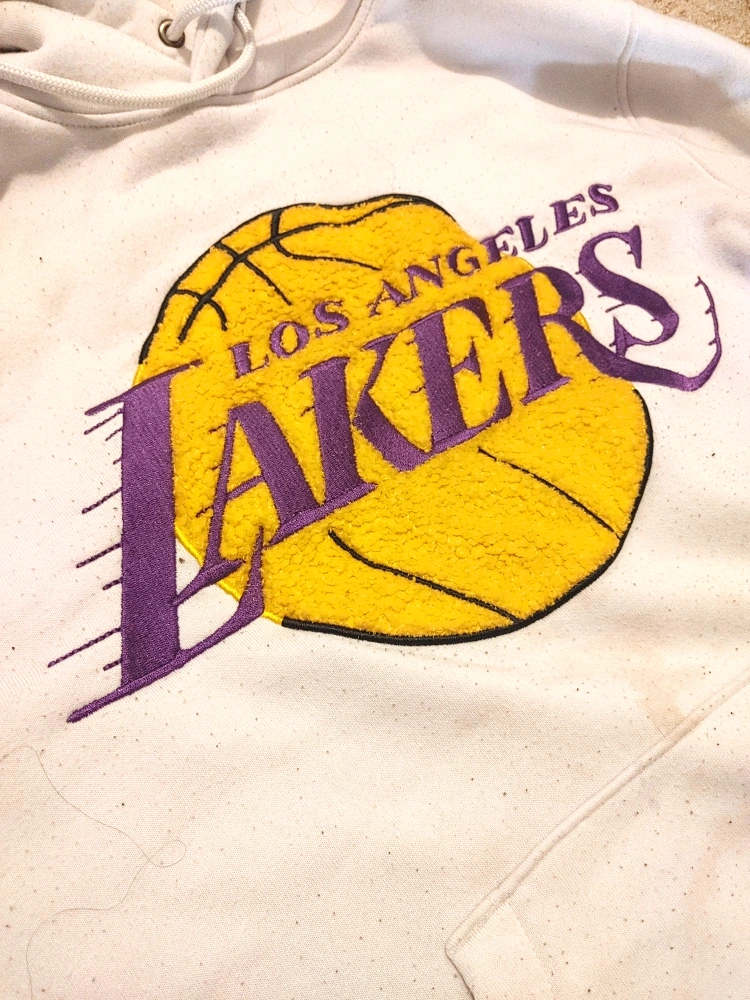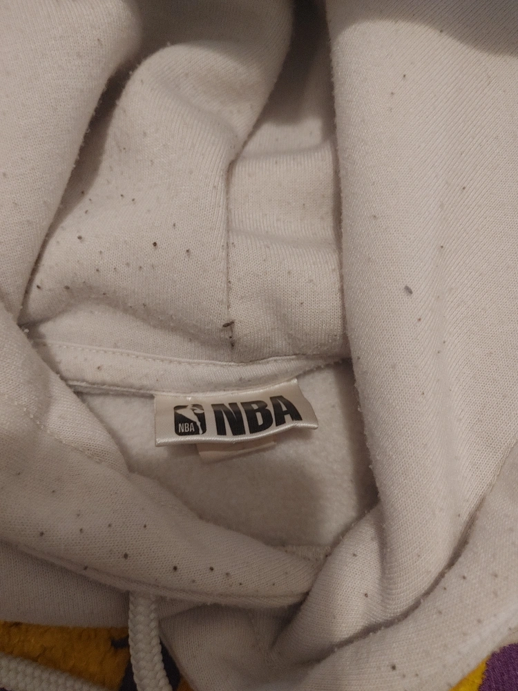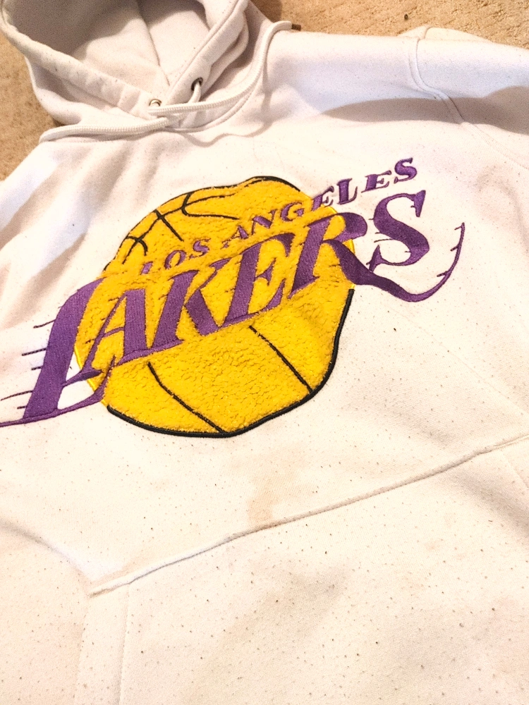 Off-white NBA Los Angeles Lakers hoodie. Features embroidered Lakers logo. Medium size. Some minor speckles throughout.