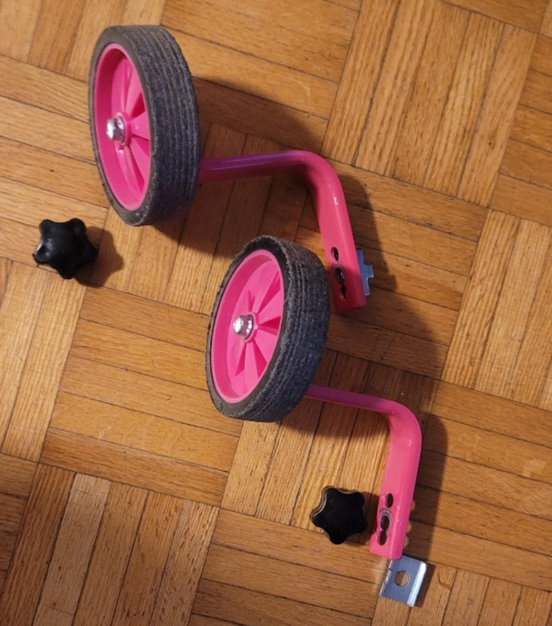 Pair of pink training wheels. Includes mounting hardware. Suitable for children's bicycles.
